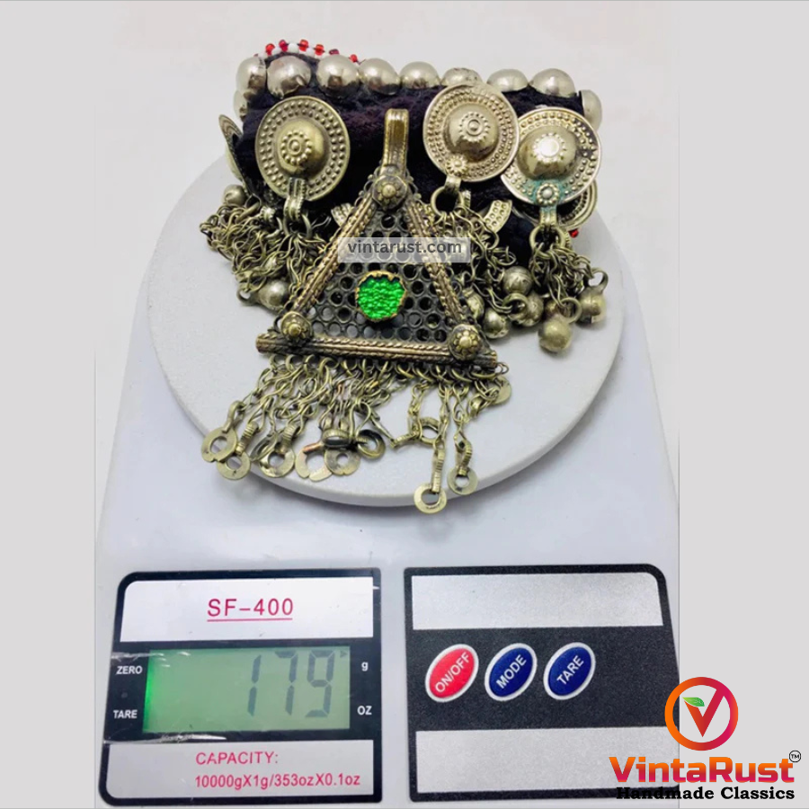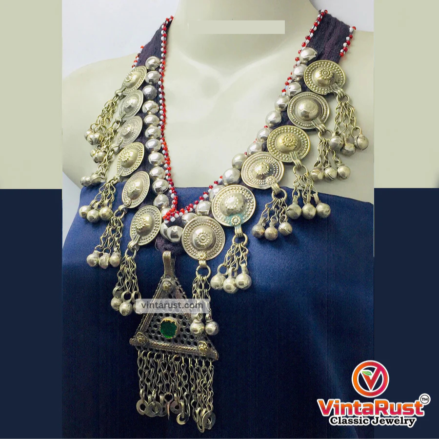 This Turkmen traditionally-rich tribal ornament is one of the incredible pieces of jewelry from our collection of Turkmen jewelry. This ethnic tribal necklace with metallic silver buttons, tribal coins, and rhythmic tassels is a statement tribal necklace. This amazing tribal choker necklace is comprised of an antique triangular-shaped pendant.