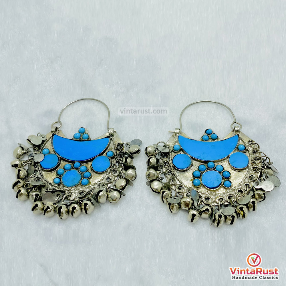 Handmade Turquoise Boho Bell Drop Earrings feature natural turquoise stones paired with delicately crafted silver dangling bells for a timeless artisan look. Each pair is thoughtfully handcrafted, highlighting the vibrant blue tones of turquoise against oxidized silver for an authentic bohemian charm.