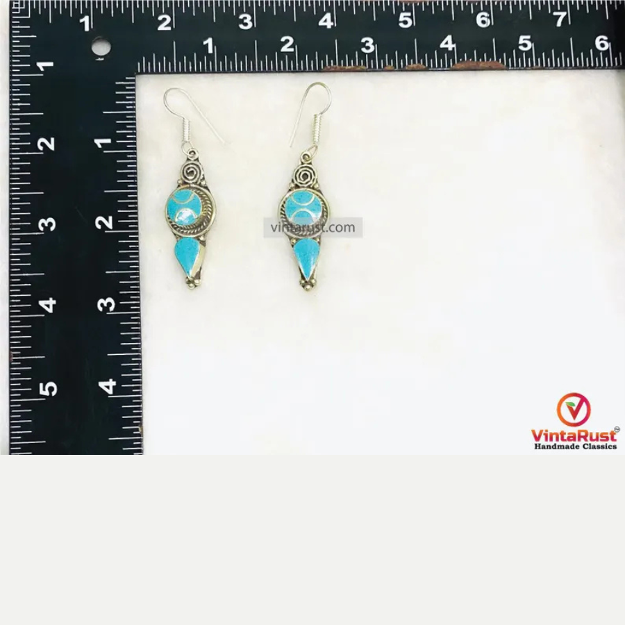These handmade Nepalese earrings are made with turquoise stones in a vintage style. The bright blue shade with silver toned metal gives them a nice look. A good piece for daily wear or special occasions.