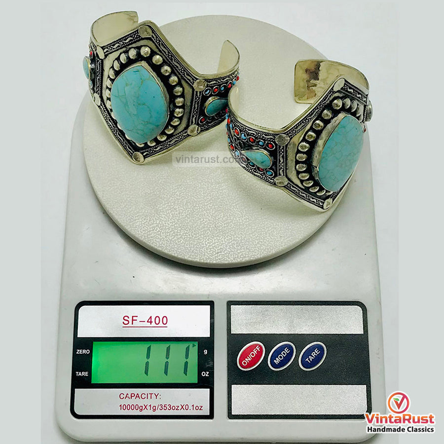 Looking for a traditional and trendy accessory to add to your wardrobe then check out this exquisite semi-precious turquoise stone Bohemian handcuff bracelet. This stunning piece features a rusty silver tone, intricately handcrafted with inlaid stones and archaic motifs, perfect for showcasing all the tribal vibes.