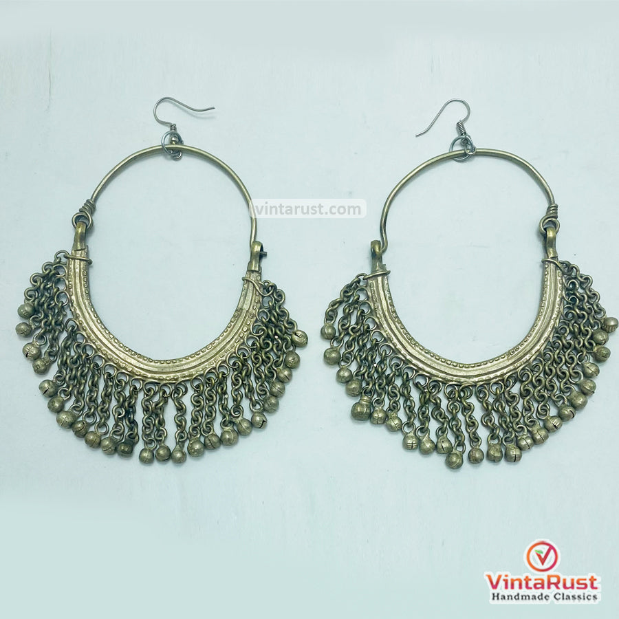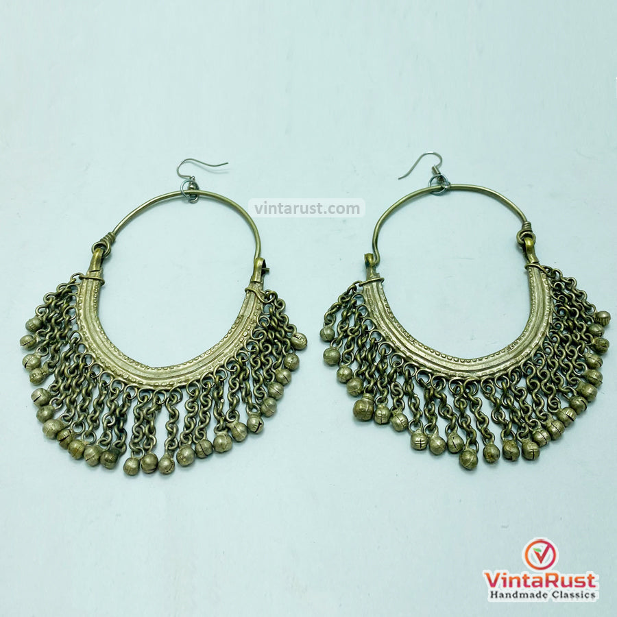 Make a bold style statement with these Handmade Vintage Bells Drop Earrings, inspired by traditional Afghan tribal jewelry. Featuring golden-hued metal, dramatic tassels, and rhythmic bell accents, these earrings bring a perfect blend of vintage charm and bohemian elegance. The long dangle design creates graceful movement, making them an eye-catching accessory for both everyday wear and special occasions. Carefully crafted from high-quality metal alloy, they are lightweight yet durable, offering comfort along with timeless appeal.