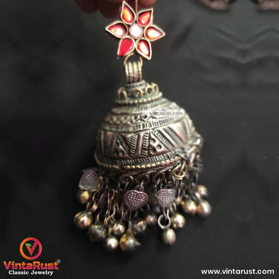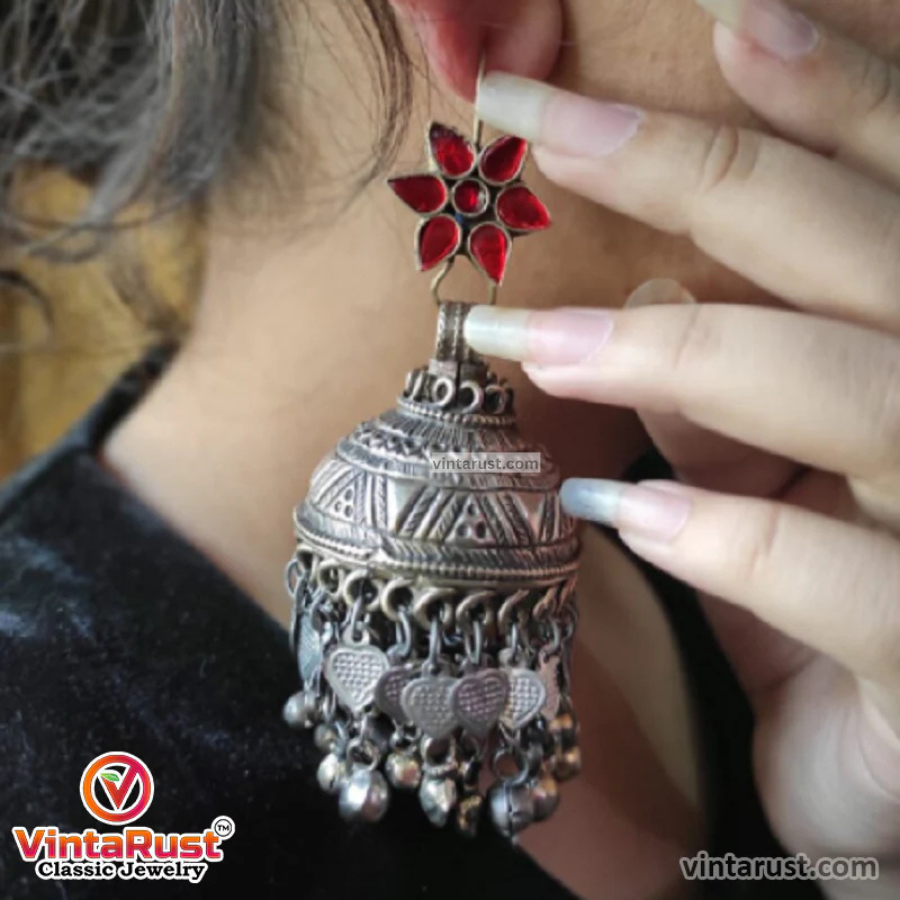 These earrings have been crafted by skilled artisans, and the intricate details of the design showcase the beauty of traditional Afghan jewelry-making techniques.The Jhumka earrings feature a bold and elegant circular design, with a delicate hanging jhumka at the bottom. The use of pink glass stones adds a pop of color and femininity to the piece, making it perfect for both casual and formal occasio