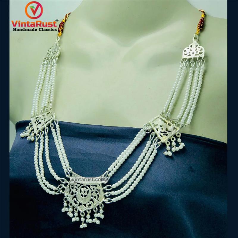 You can add charm and charisma to your elegant personality with this alluring handcrafted mala necklace. This beaded necklace is designed beautifully by South Asian craftsmen. Besides being polished this necklace depicts natural vibes whenever you wear it. The finest quality material is used while crafting this elegant tribal jewelry. White pearl beads are used for spacing in this necklace and a cord of fine quality is used for wearing this traditionally-rich necklace.