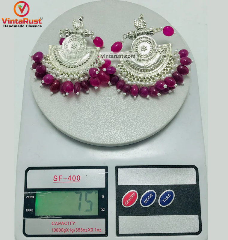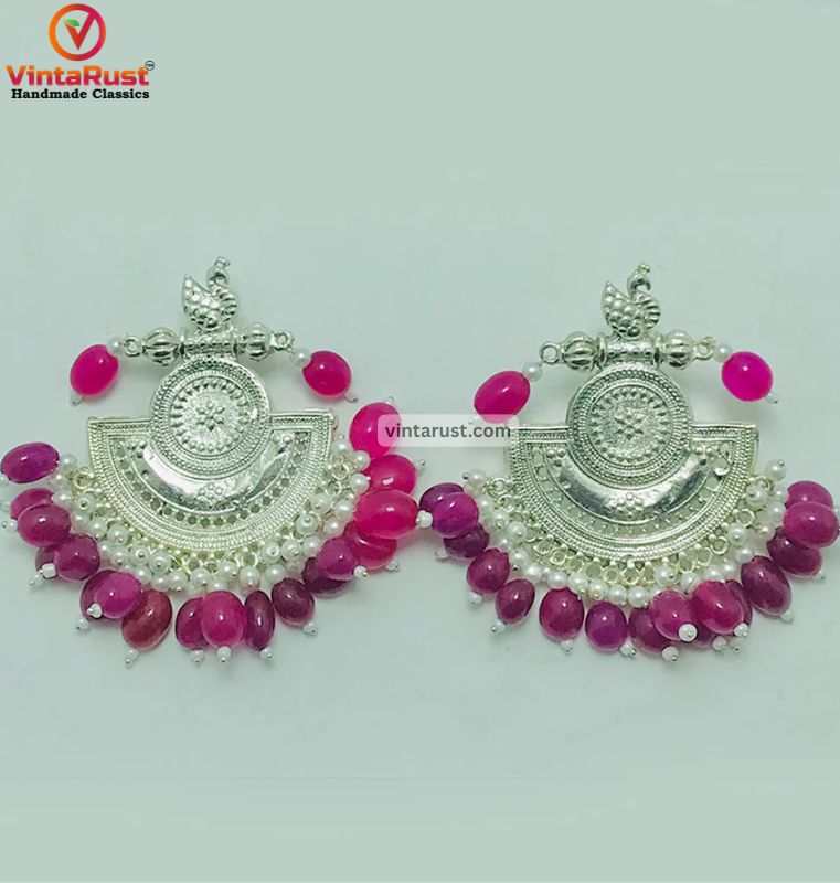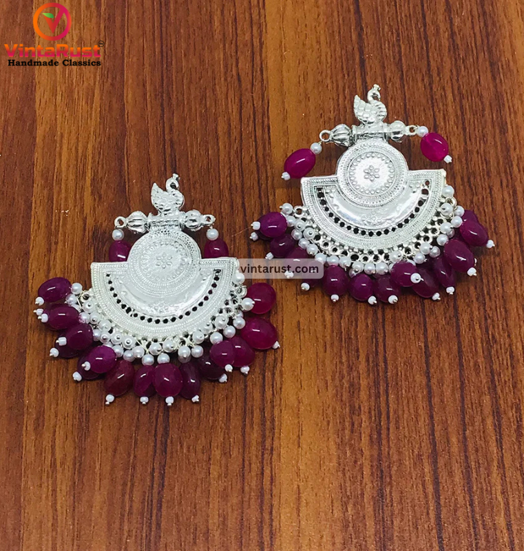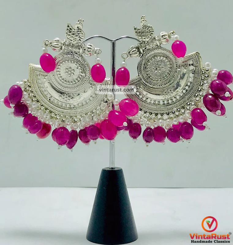 These silver-hued Indian earrings are intricately crafted tribal piece from our collection. The design crafted on these ancient-looking earrings with beads is one of the unique designs. These Indian earrings are beautified with pink beads that are enhancing the charm of these traditional earrings. The heavenly earrings are suitable for normal pierced ears.