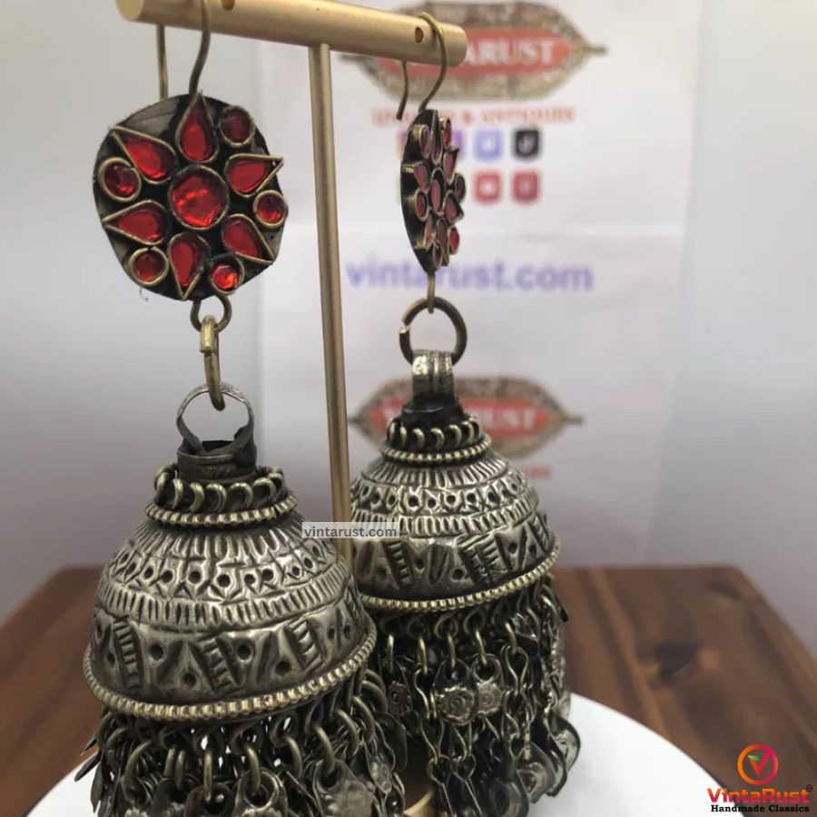 These bold and charming vintage Kuchi tribal earrings were made in the early 90s. These ethnic tribal earrings have large dome-shaped hangings with hand-engraved ancient designs that make this piece a statement tribal ornament. On the top of these earrings, red glass stones are beautified in a flower shape that adds even more beauty to these exquisite tribal earrings.