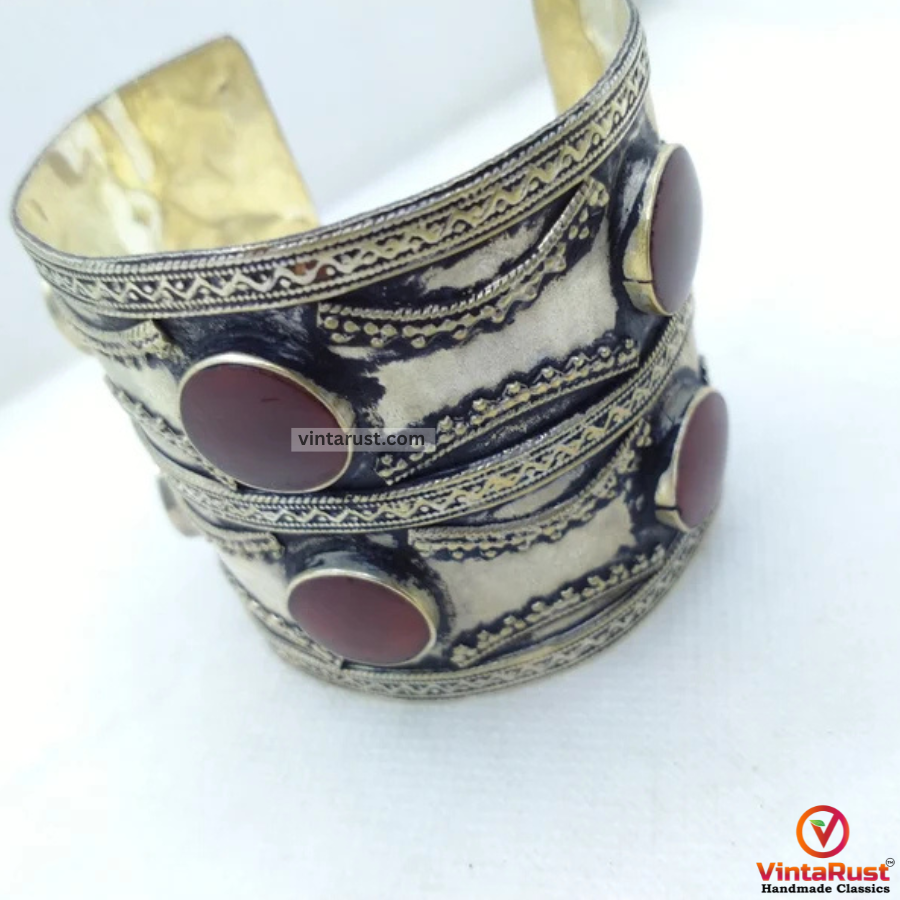 The Kuchi Big Tribal Stones Cuff Bracelet is a distinctive piece of jewelry that originates from the Kuchi tribe, a nomadic group primarily found in Afghanistan and neighboring regions. This bracelet is known for its bold and ornate design, characterized by the following features:Size: The "Big" in its name suggests that this cuff bracelet is larger in size, making it a statement piece that draws attention.Materials: It is typically crafted using a combination of metal and various semi-precious stones. The metalwork often features intricate filigree, etching, or embossing, while the stones can include colorful gems or beads.Tribal Influence: The design is heavily influenced by the Kuchi tribal aesthetic, which tends to be vibrant, geometric, and symbolic. These elements reflect the rich cultural heritage of the Kuchi people.Cuff Style: This bracelet is designed as a cuff, which means it doesn't have a traditional clasp. Instead, it can be slipped onto the wrist and adjusted to fit comfortably.Versatile: The Kuchi Big Tribal Stones Cuff Bracelet can be worn on various occasions, from casual outings to more formal events. It's often chosen by those who appreciate unique and culturally inspired accessories.