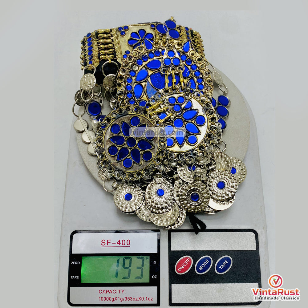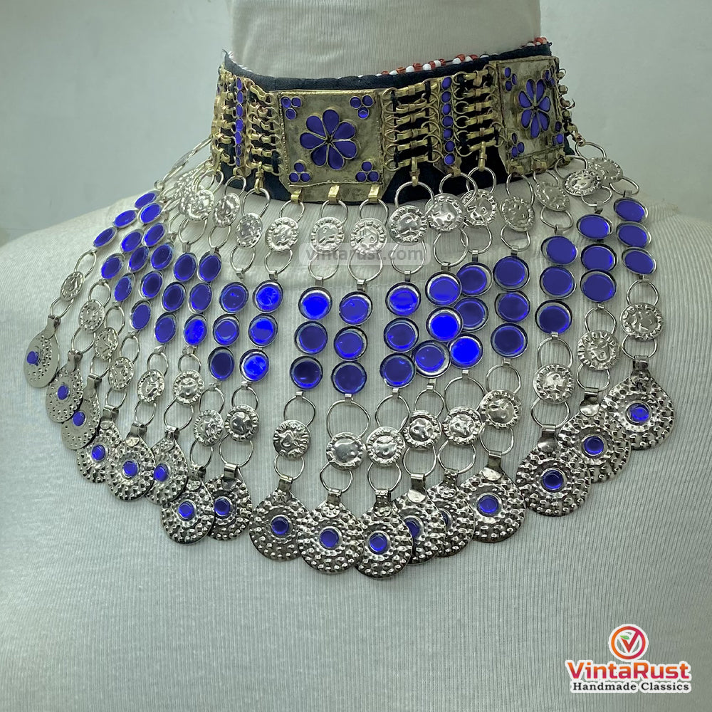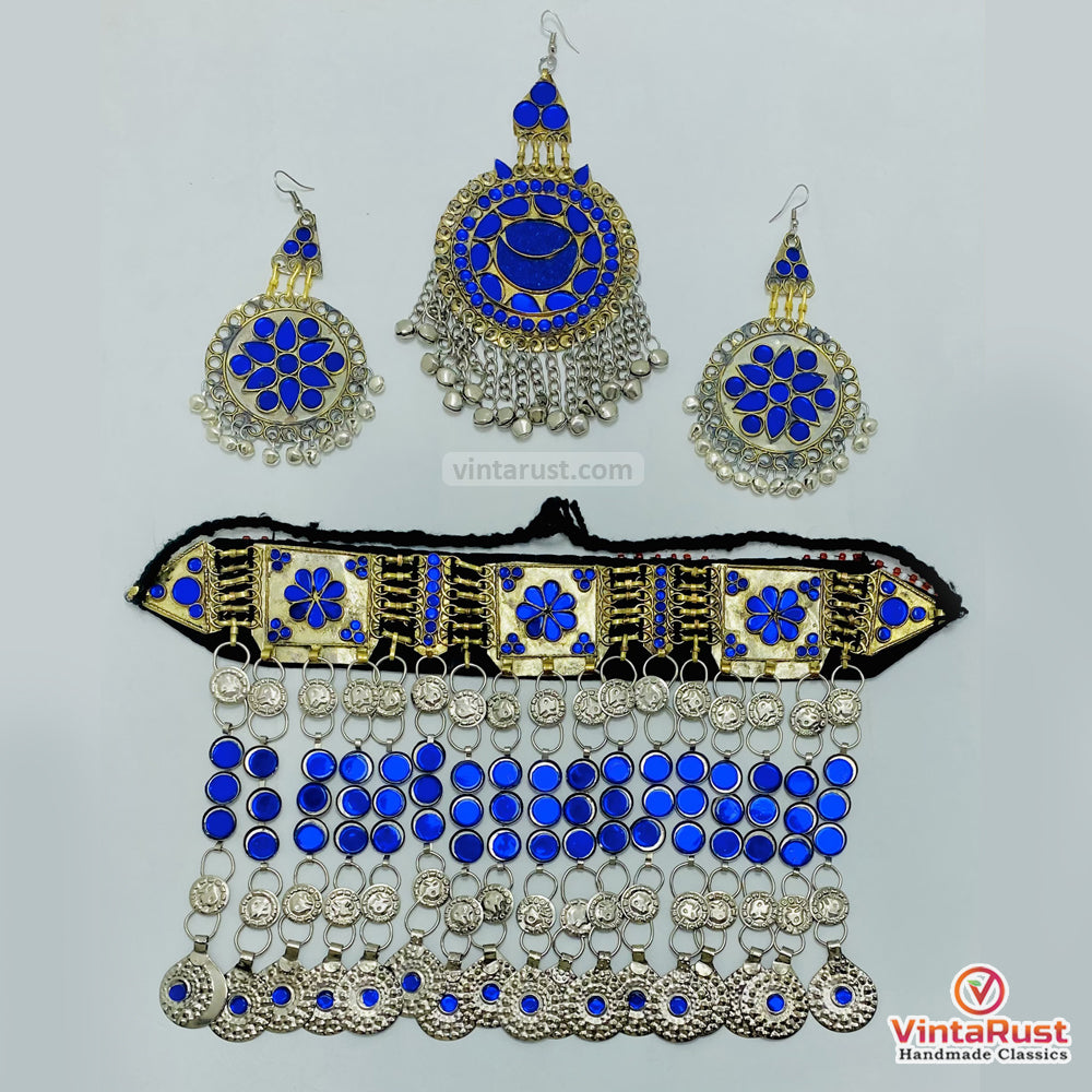 This Kuchi Blue Glass Coin Jewelry Set is a striking statement piece inspired by traditional Afghan tribal craftsmanship. This handcrafted set features a bold choker adorned with vibrant blue glass accents and layered coin detailing, creating rich texture, movement, and an unmistakable bohemian presence. The intricate metalwork and saturated blue tones make it a standout accessory that reflects authentic Kuchi heritage.