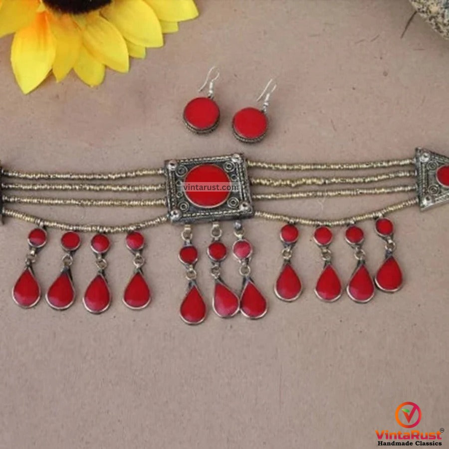 Indulge in the beauty and heritage of Afghan craftsmanship with the Afghan Kuchi Choker with Stones and Earrings Set. Embrace the spirit of traditional jewelry and exude an aura of elegance and grace wherever you go.