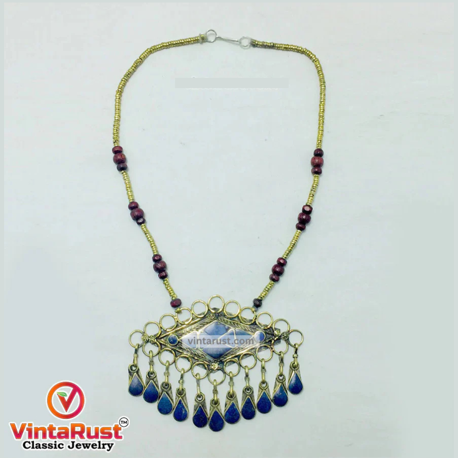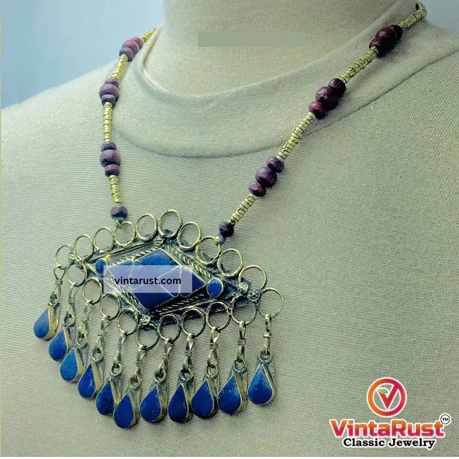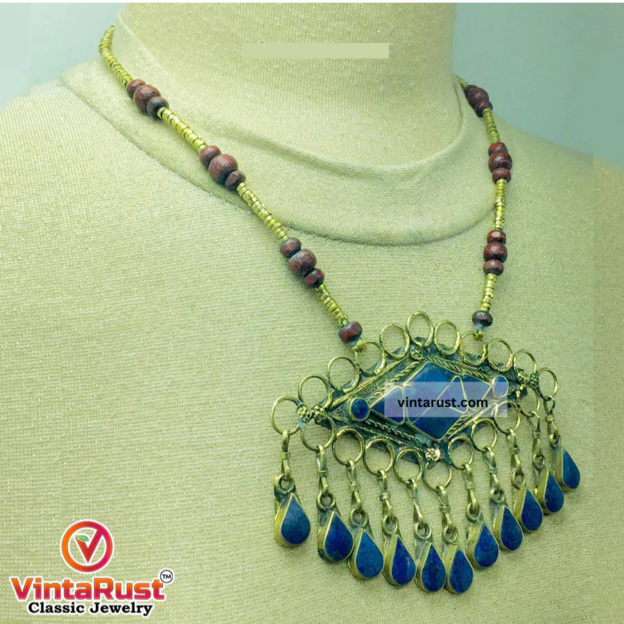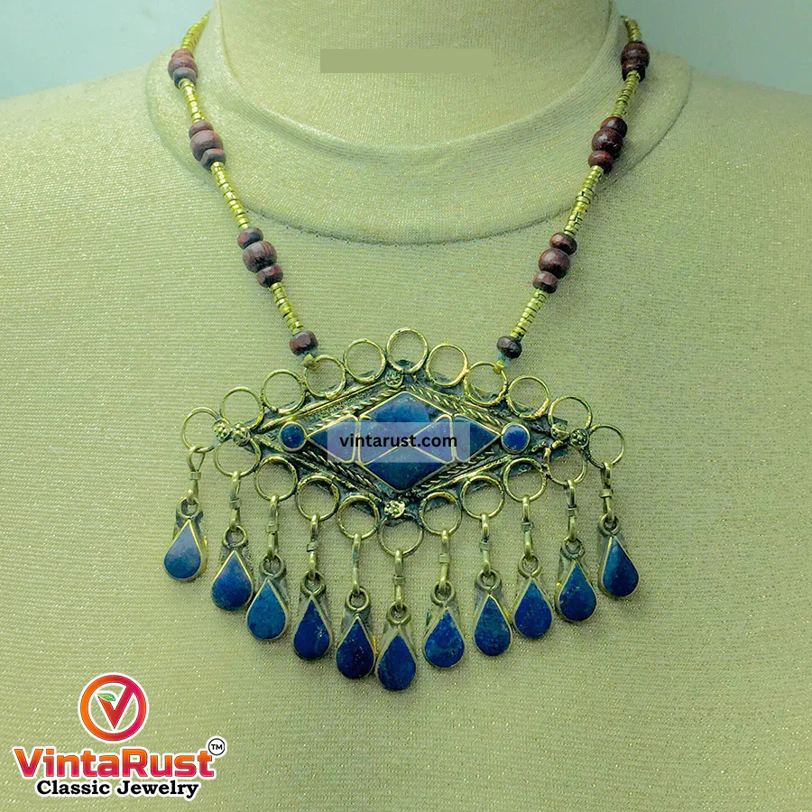 This elegant-looking piece of tribal jewelry is made up of semi-precious lapis lazuli stones of blue color. This tribal choker necklace with semi-precious stones is admired by a large audience. Brown beads and golden wire are used to enhance the beauty of this piece. This rustic-hued tribal necklace has hangings of a teardrop shape.
