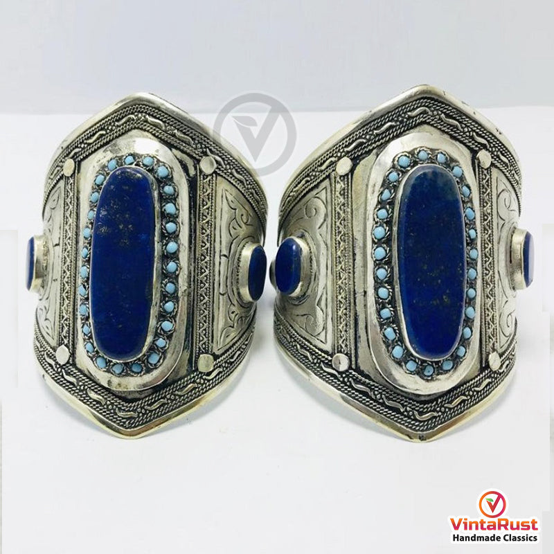 This enthralling vintage tribal cuff bracelet is one of the most demanded tribal ornaments we have in our collection of tribal jewelry. Made up of sterling silver, lapis lazuli and turquoise semi-precious stones, this tribal cuff bracelet can be adjusted according to your wrist size. Borders of this stunning tribal bracelet are beautified with delicate and ethnic engraved designs.