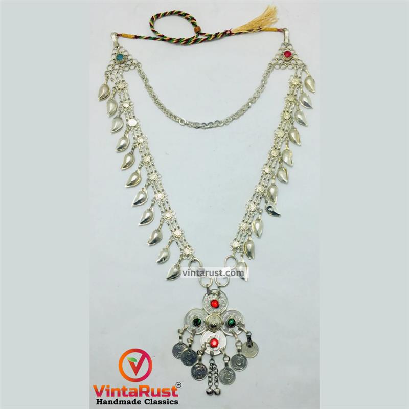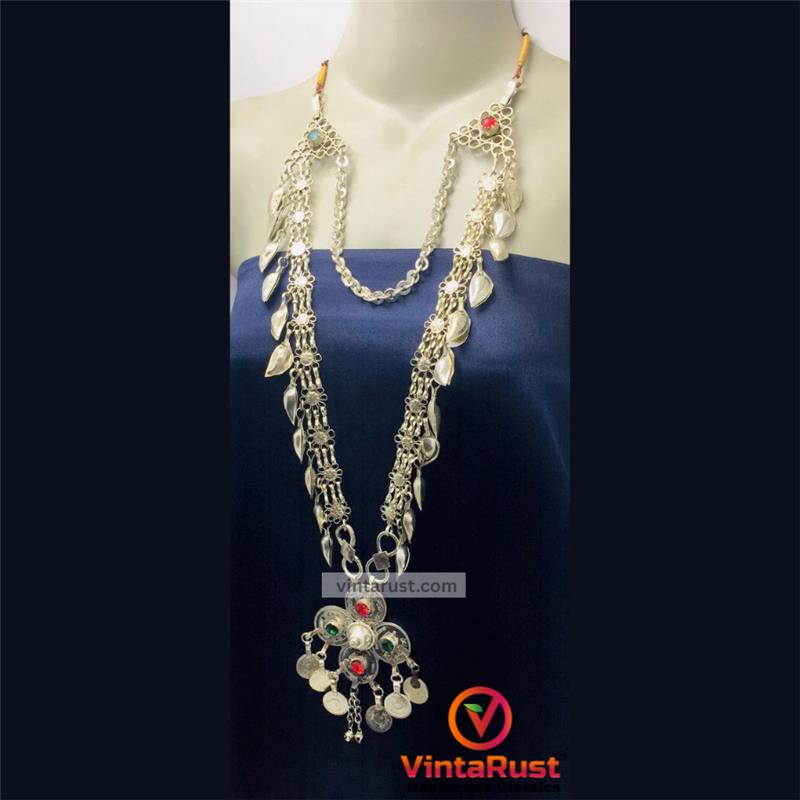 At its heart, a pendant featuring traditional silver coins makes this necklace a standout tribal silver pendant necklace. A silver-hued chain connects the sides, while multihued glass stones amplify its charm. The incorporation of metallic flowers and petals reflects the elegance of ethnic handmade silver necklaces, and the dangling charms create a melodious sound with every movement.