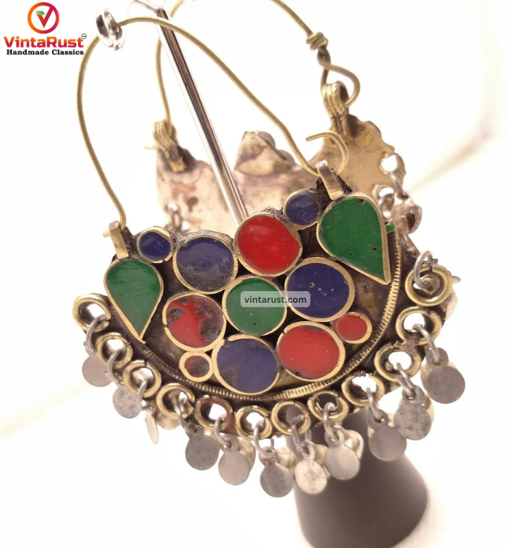 The vintage earrings are over-size big hoops, known as Chandbali. The local wear them with their traditional attires, as this pair is quite chunky and vibrant. It is made with metal alloy and has floral pattern carved all over. The green, red, and blue stone inlays and dangling bells are completing the design in an astonishing way.