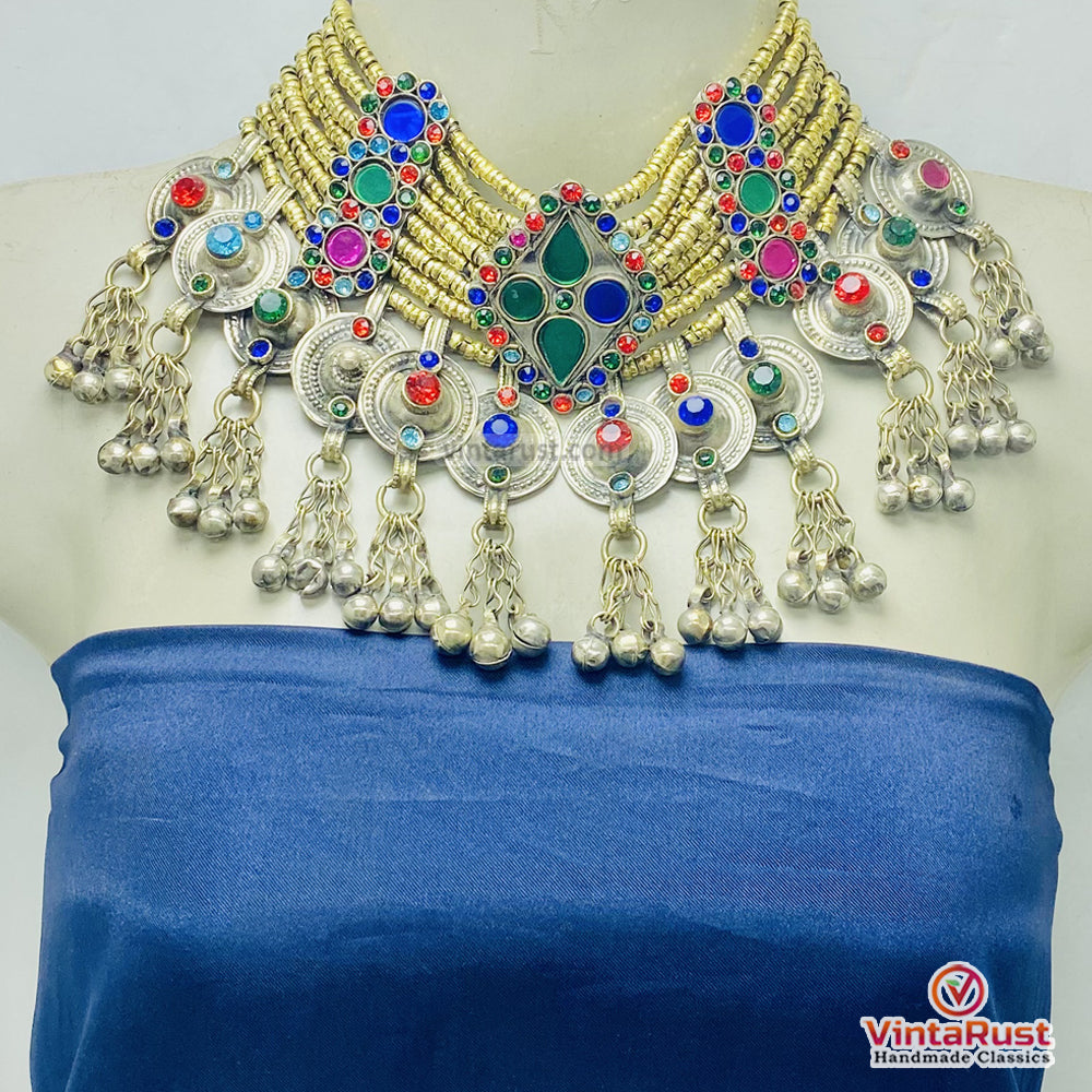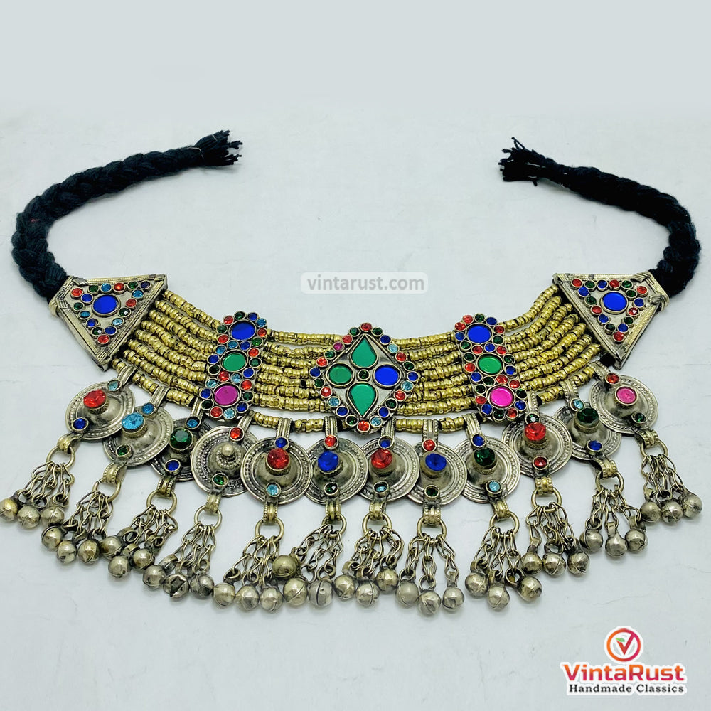 Designed as a wide statement choker, this necklace is accented with dangling metal charms that add movement and a dramatic finish. The multicolor stones reflect light beautifully, making it a perfect centerpiece for boho outfits, festivals, weddings, and cultural events.