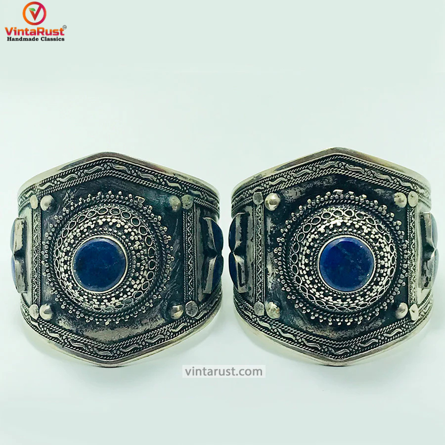 This beautiful handcrafted Indian cuff bracelet features stunning lapis stones, skillfully crafted by talented artisans of South Asia. A large, round natural stone is centered on this rustic-hued cuff, surrounded by elegant filigree work that enhances the beauty of this gemstone beaded bracelet. Known as a healing stone bracelet, this piece not only exudes style but also brings an element of natural wellness.