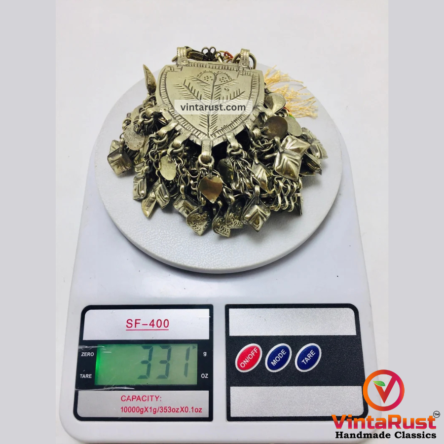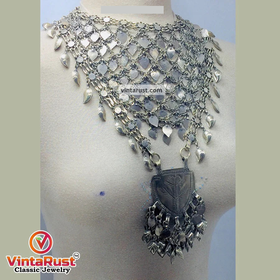 This exceptional silver necklace is a massive, silver-toned tribal piece, intricately crafted to showcase traditional artistry. One of our most unique silver jewelry items, this tribal necklace features a large silver pendant adorned with beautiful dangling tassels, adding movement and charm. Metallic leaves are meticulously placed, enhancing the elegance of this standout necklace.