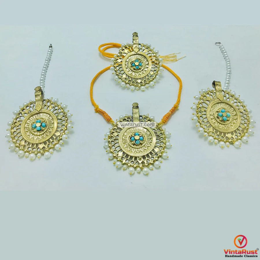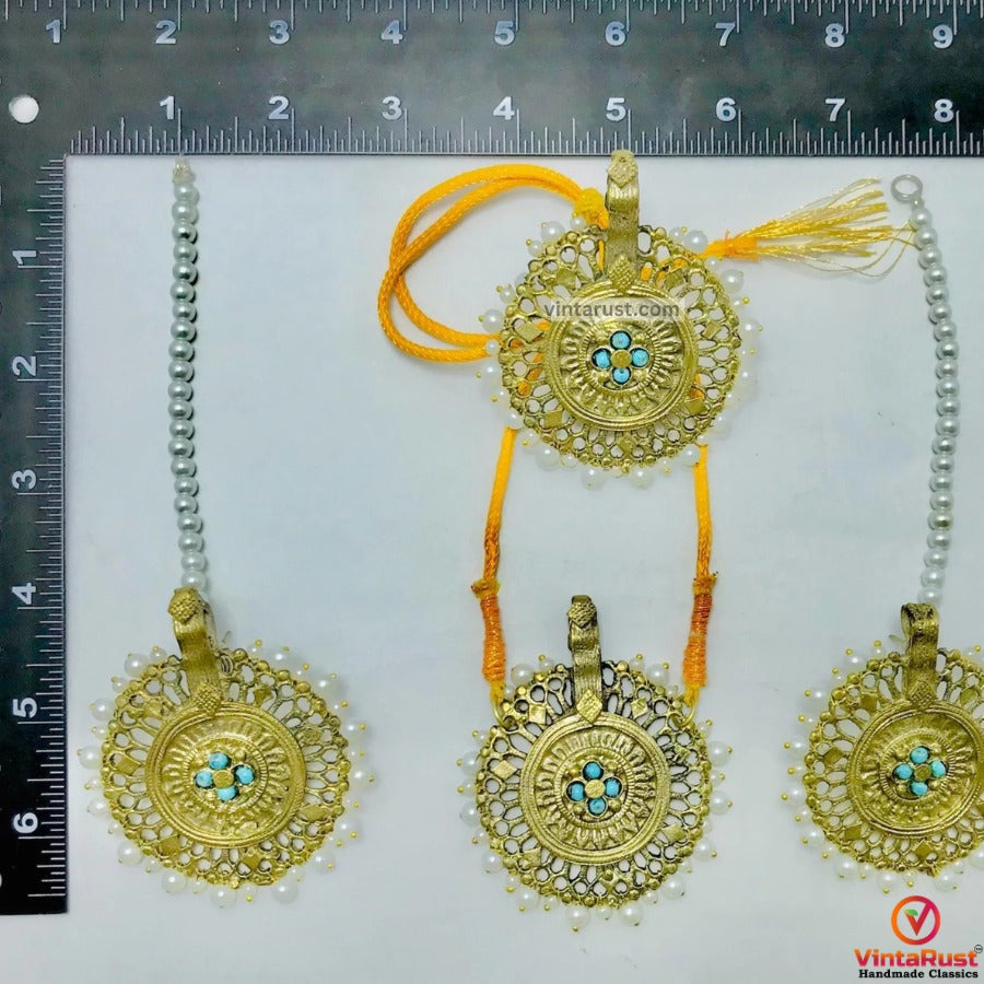 Pearls and golden big motif jewelry combine the elegance of pearls with the luxurious touch of golden motifs, creating a stunning and sophisticated aesthetic. Pearls are renowned for their timeless beauty and natural luster, while golden motifs add a touch of opulence and glamour.These pieces of jewelry often feature large pearls as the centerpiece, accompanied by intricately designed golden motifs. The golden motifs may take various forms, such as floral patterns, geometric shapes, or intricate filigree work, which enhance the overall visual appeal of the jewelry.