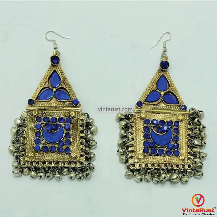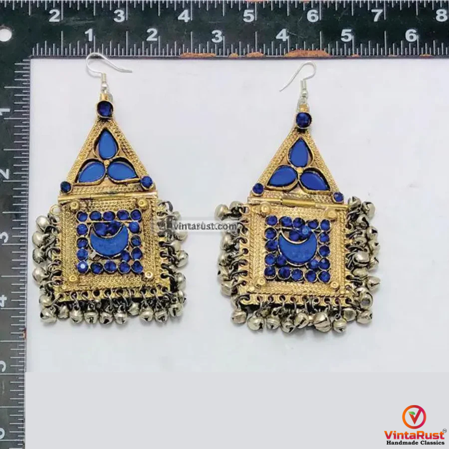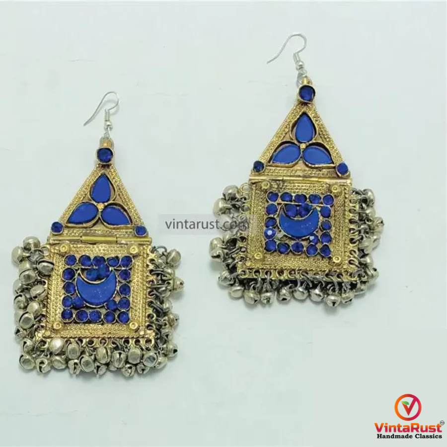 Each earring is decorated with intricate blue glass stones set into a square panel, surrounded by delicate mini metallic bells that produce a soft, traditional jingle with every movement. The mix of triangle and square shapes, along with the layered embellishments, makes these earrings a true statement piece for boho lovers and cultural jewelry collectors alike.
