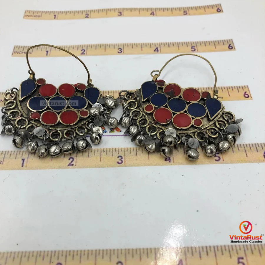 The ethnic earrings are soaked in silver rustic alloys. The unique light in weight tribal earrings are ornated with chunky dangling bells at the bottom, making it an alluring pair of ornament. The blue and red stone inlays are making them a striking traditional pair.