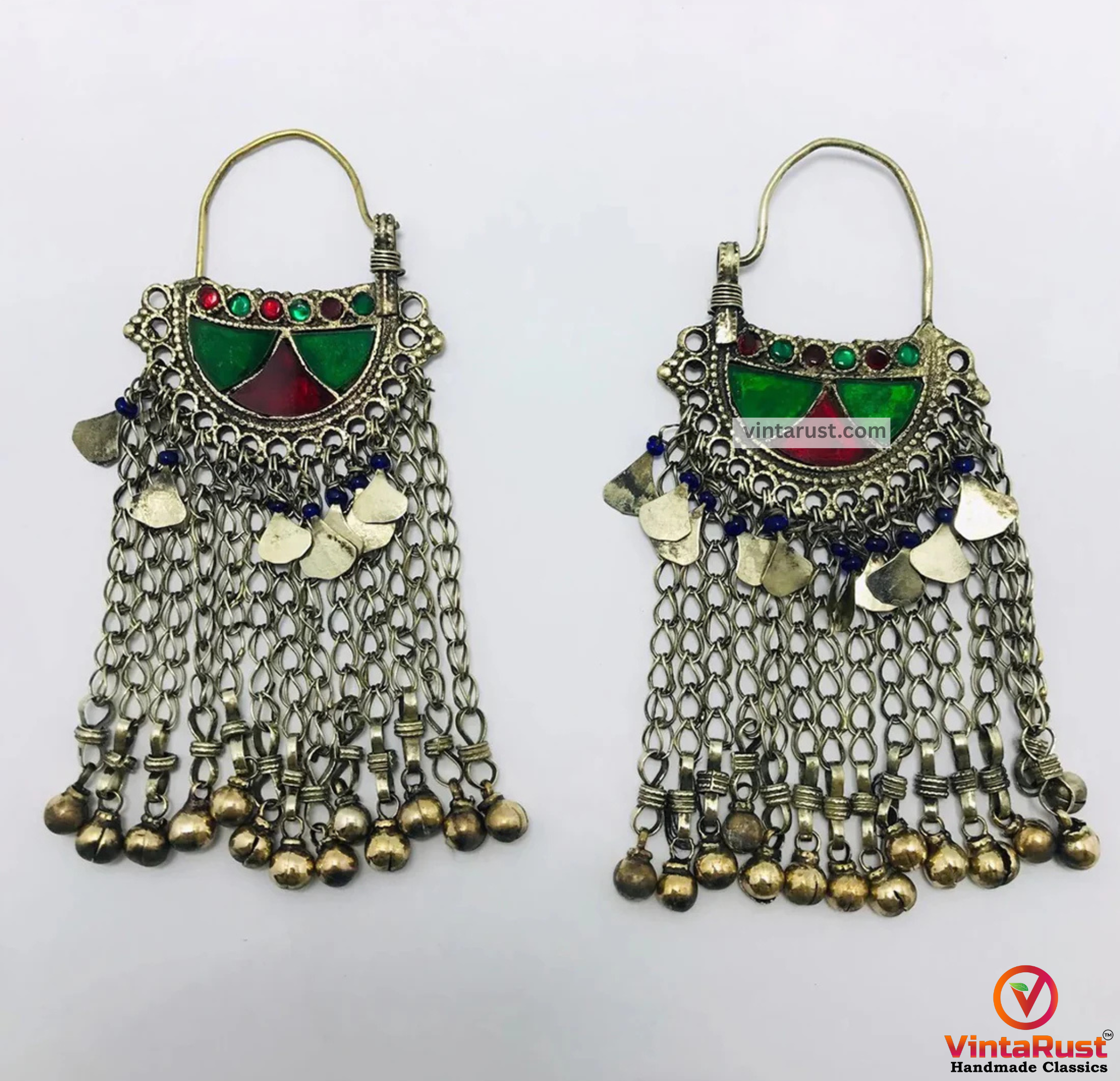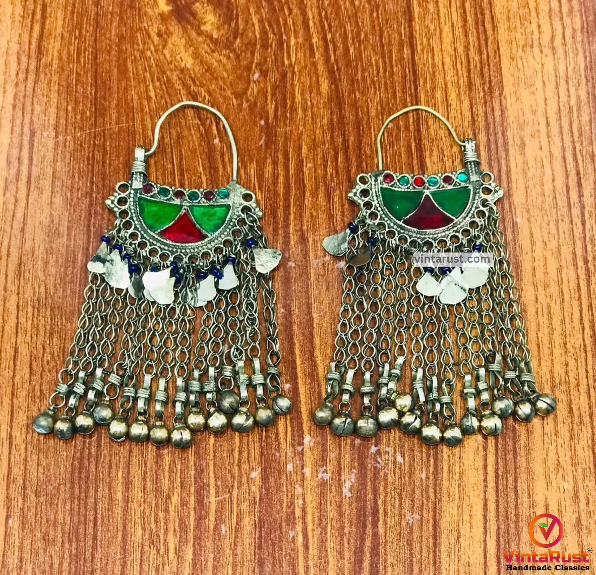 • The use of green and red glass stones on this tribal piece are in an aesthetic manner and it forms a unique and alluring design. The Kuchi tribe has been famous for their masterpieces and these earrings are one of their masterpieces.