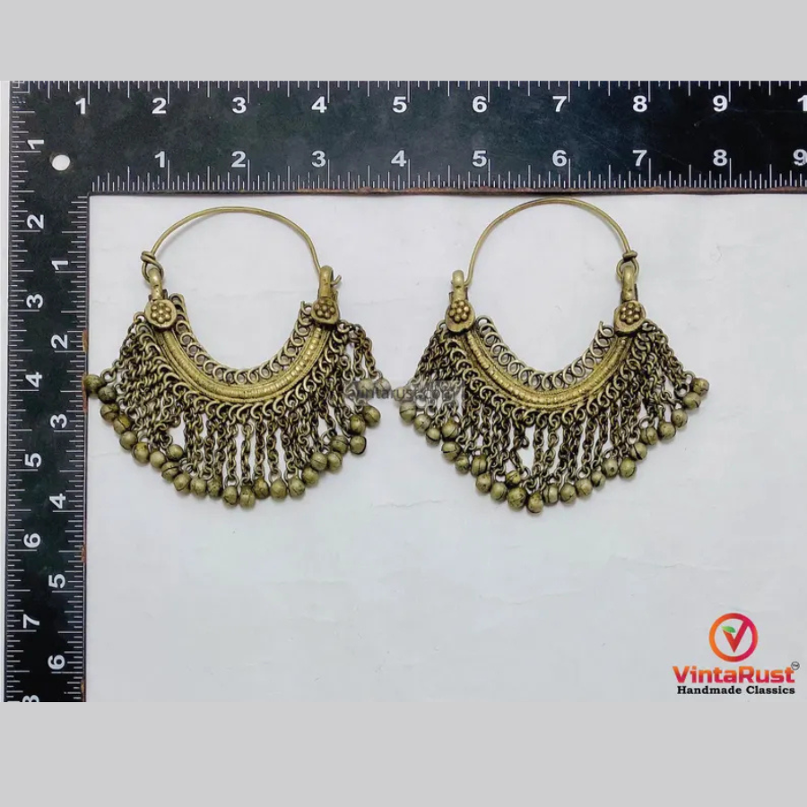 These rustic hoop earrings have a classic Kuchi tribal design with small bell accents. The antique gold finish gives them a natural, vintage look. They are lightweight and easy to wear. Perfect for adding a simple statement to any outfit.