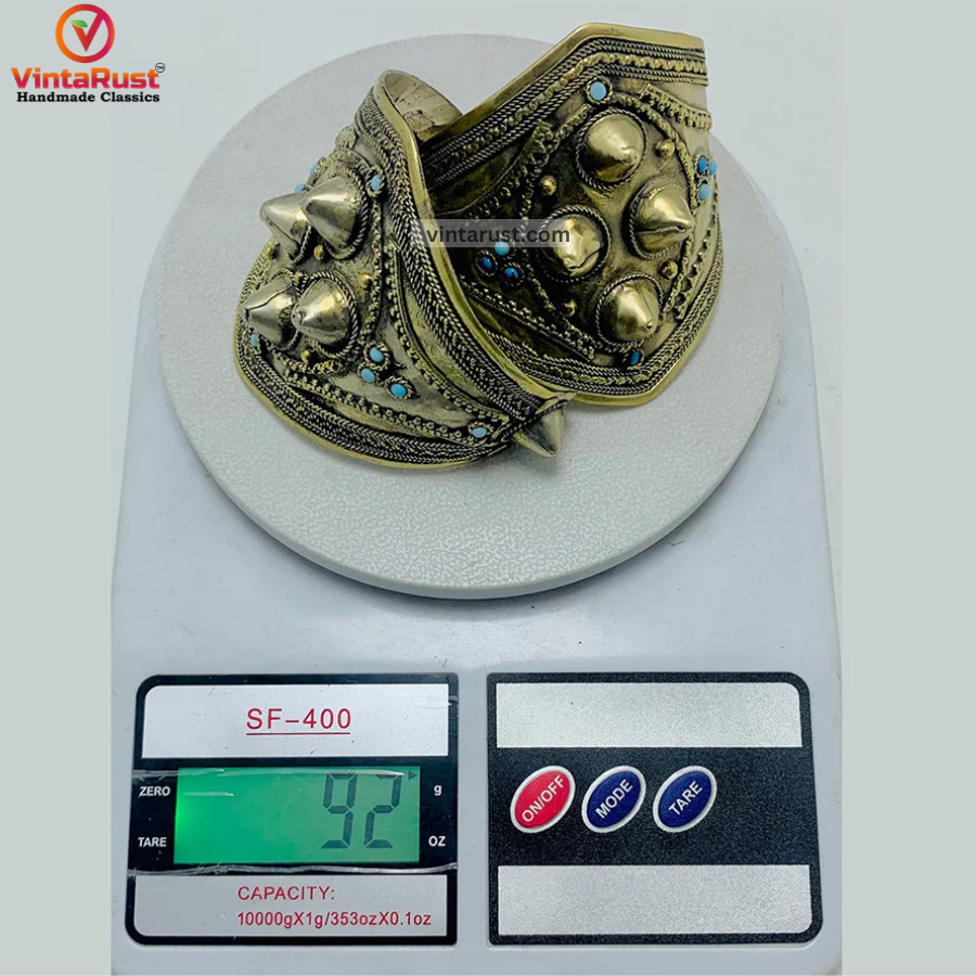 This statement tribal handcuff with turquoise stones is a lightweight jewelry item that can be worn in any event. This tribal piece will be a perfect match with traditional and modern attires.