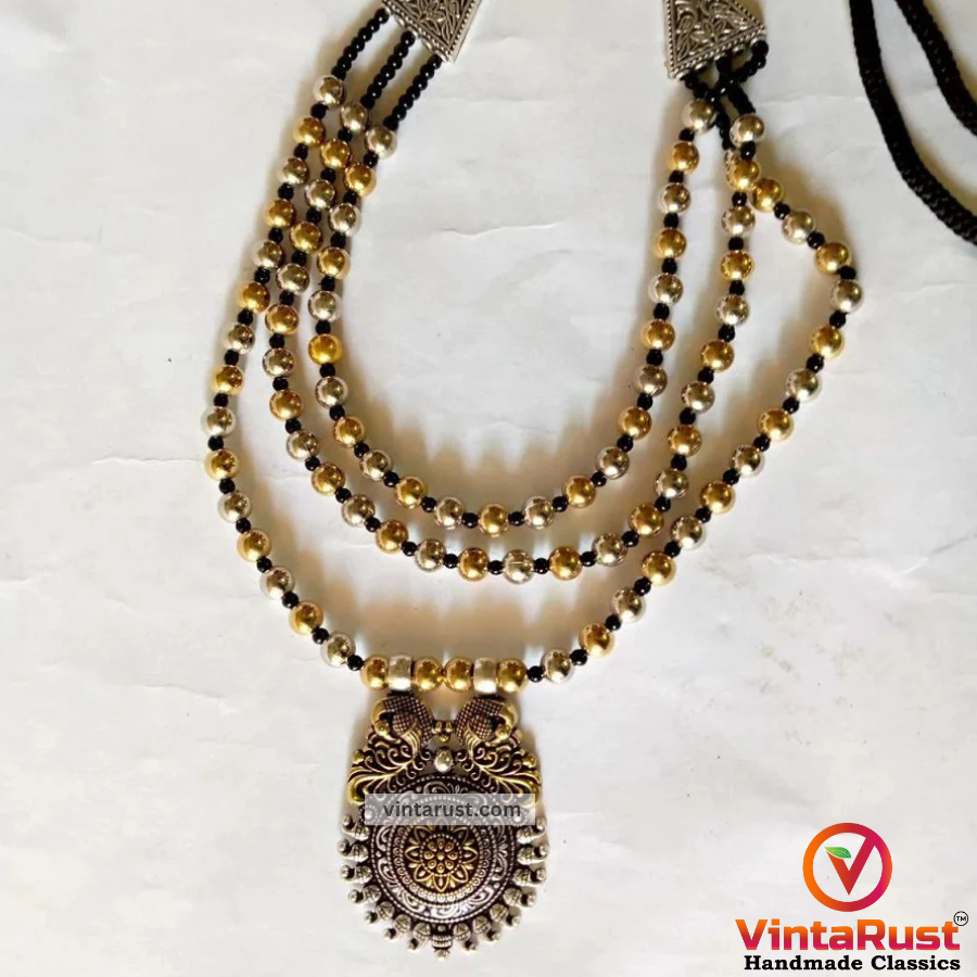 This beautiful silver and golden beads necklace will leave you spellbound with its exceptional beauty. The exquisite pendant inlaid on this necklace gives you an amazing look. This Indian necklace gives you an elegant look. The pendant of this necklace is intricately crafted which is giving historical and royal vibes.