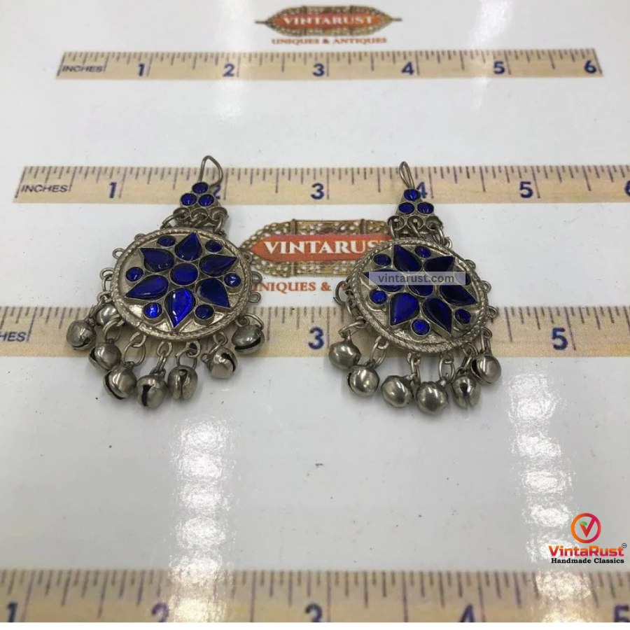 These tribal-style earrings are made with mixed metal, and all wrapped up in silver tones. While the pair is embellished with blue glass stones embedded in the center. The delicately carved floral patterns showcased over the earrings are inspired by the kuchi style of ornaments.