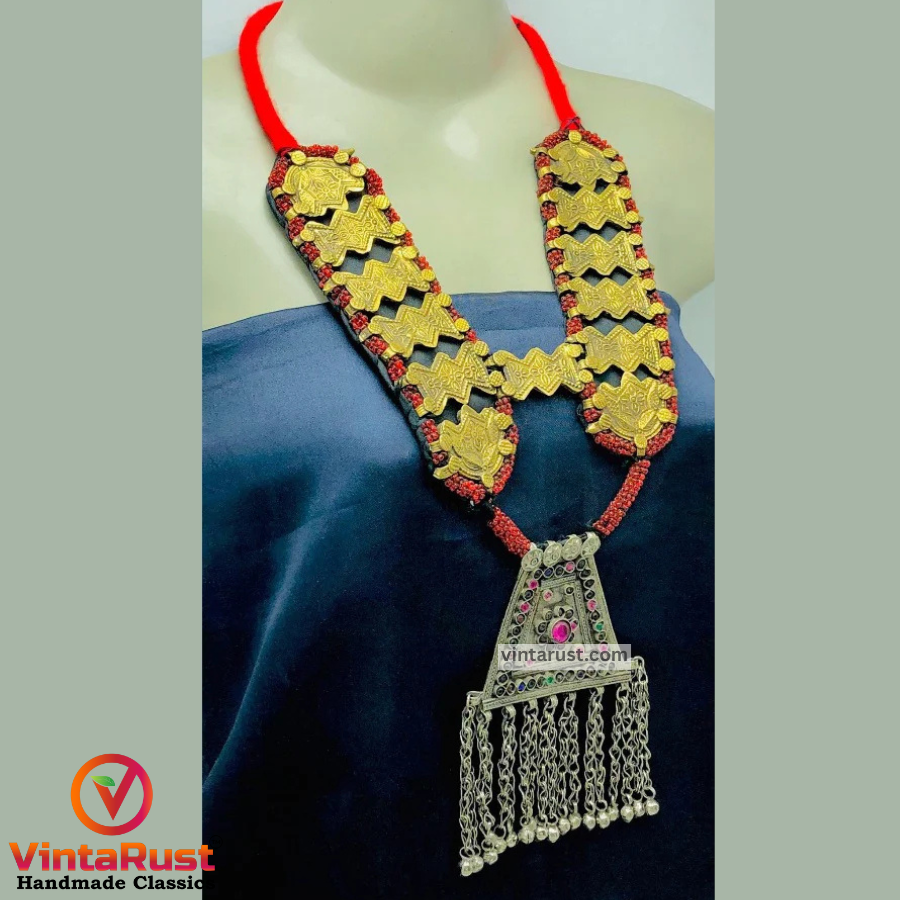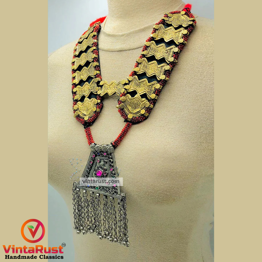On each side of the necklace, red beads and glass stones are beautified. The center of the entire necklace has a beautiful pendant which is beautified with glass stones which gives it a complete traditional look. This elegant and fascinating tribal necklace is handcrafted by talented craftsmen.