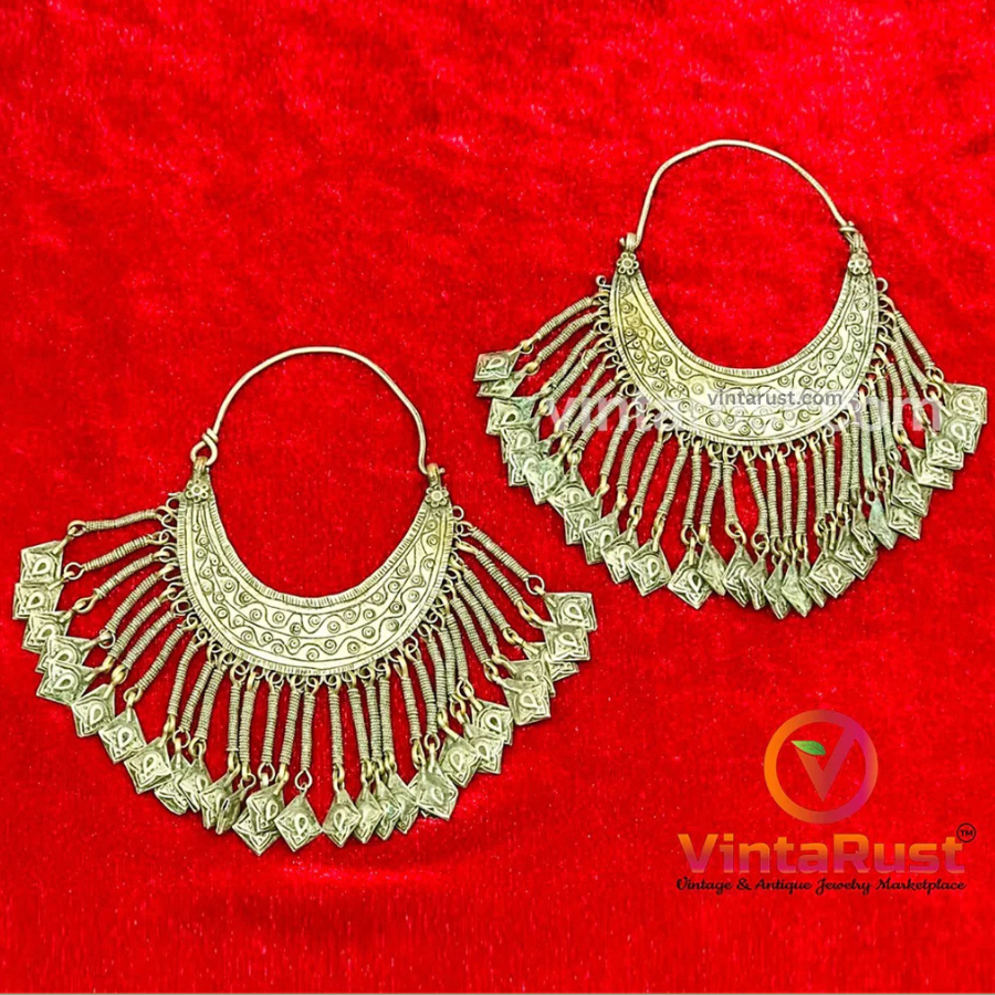 These vintage-inspired unique and beautiful tribal hoops are handcrafted by talented South Asian artists. Ensured with a lever back closure of fine quality this piece is intricately crafted to perfection by hardworking souls.The design of these earrings features intricate details and patterns, with a large size that makes them stand out and draw attention. The Kuchi-inspired style of the earrings adds a touch of cultural significance and exoticism to your overall look. Whether you wear them for a special occasion or as an everyday accessory, these earrings will make a bold and unforgettable statement.