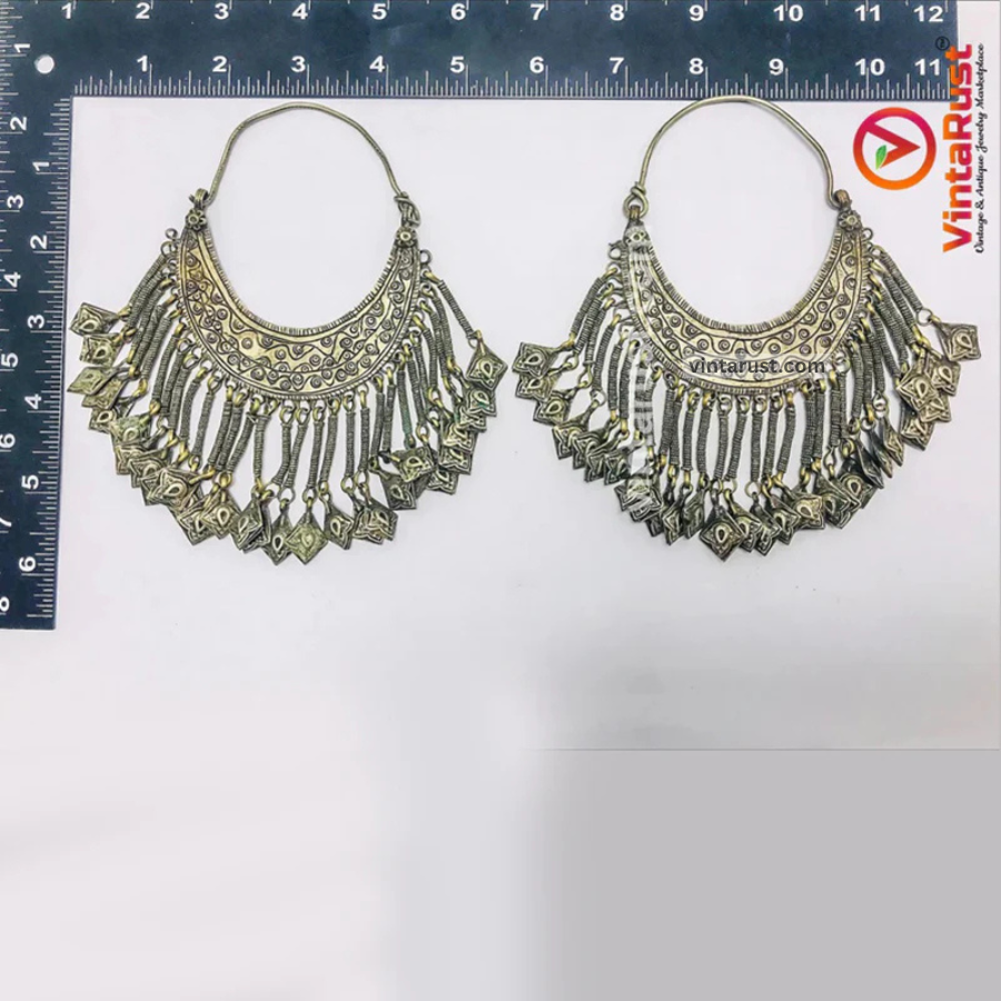 These hand-crafted antique tribal earrings are inspired by a Tribal Kuchi design. They are a beautiful ornate pair of earrings with stunning pattern and dangling tassels. Made up of the best quality of material these tribal earrings are a unique piece from our collection.
