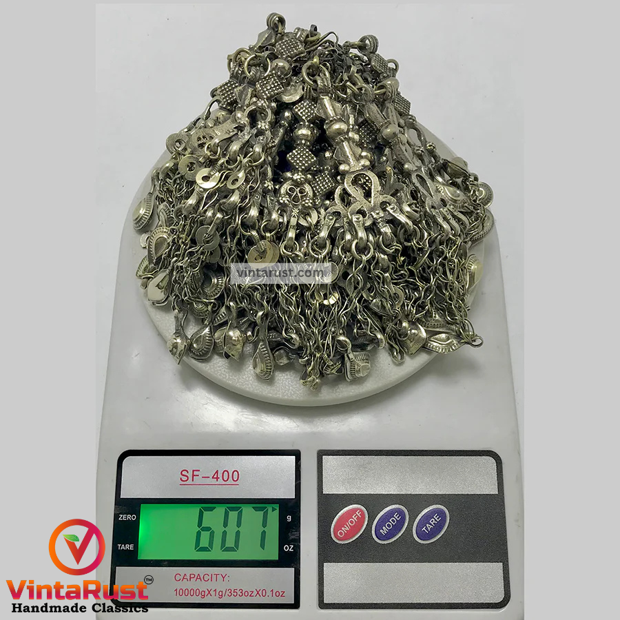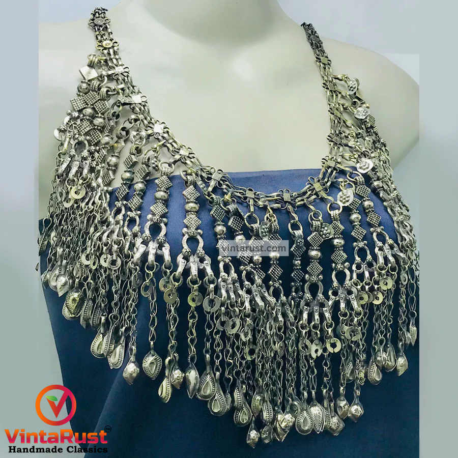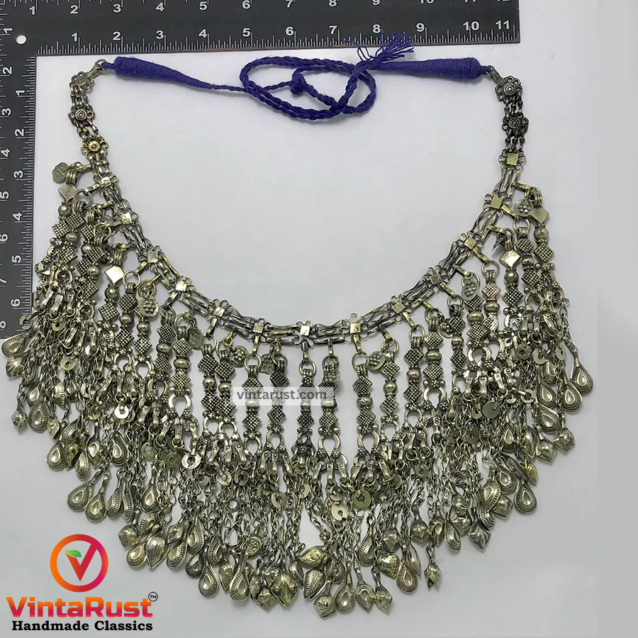 The massive tribal necklace is one of the most enthralling jewelry pieces we have in our collection. This oxidized the silver oversized tribal necklace is one of the most admired pieces from our collection. The silver dangling tassels with antique designs on every tassel make this tribal piece a worth admiring piece for our consumers.