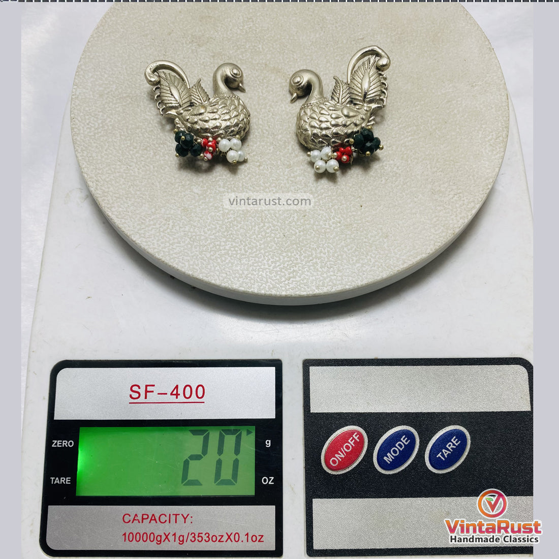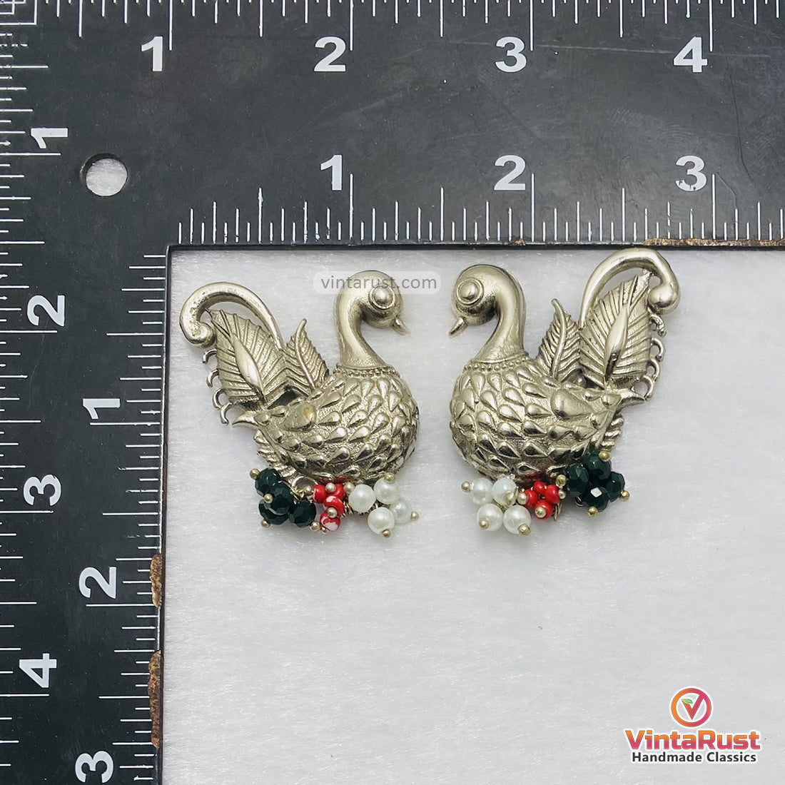 These Silver Swan Motif Beaded Statement Earrings feature an elegant swan-inspired design crafted in a silver-tone finish. The finely detailed bird motif reflects traditional artistry, giving the earrings a distinctive ethnic and vintage appeal.