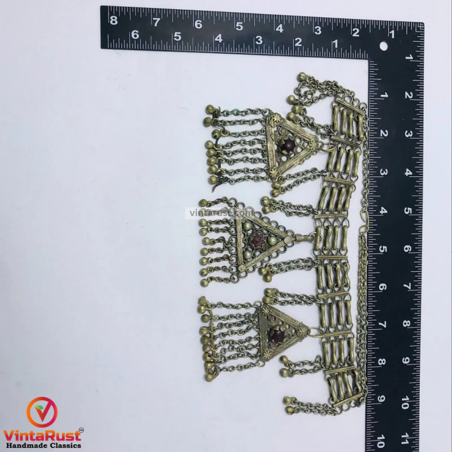 The dangling rhythmic bells and red glass stones give this ethnic piece a great tribal look. This ethnic tribal piece is crafted by the very talented artists of South Asia.