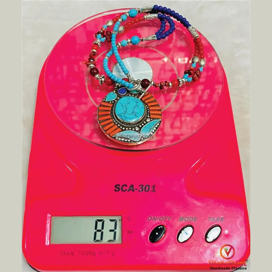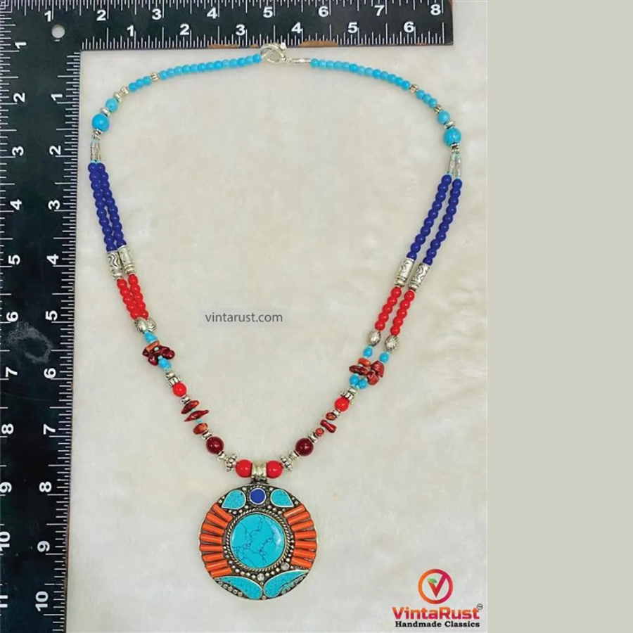 This handmade necklace is made with turquoise and coral stones. The round pendant has turquoise inlay with coral work. It gives a traditional and bold ethnic look.