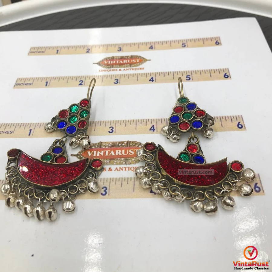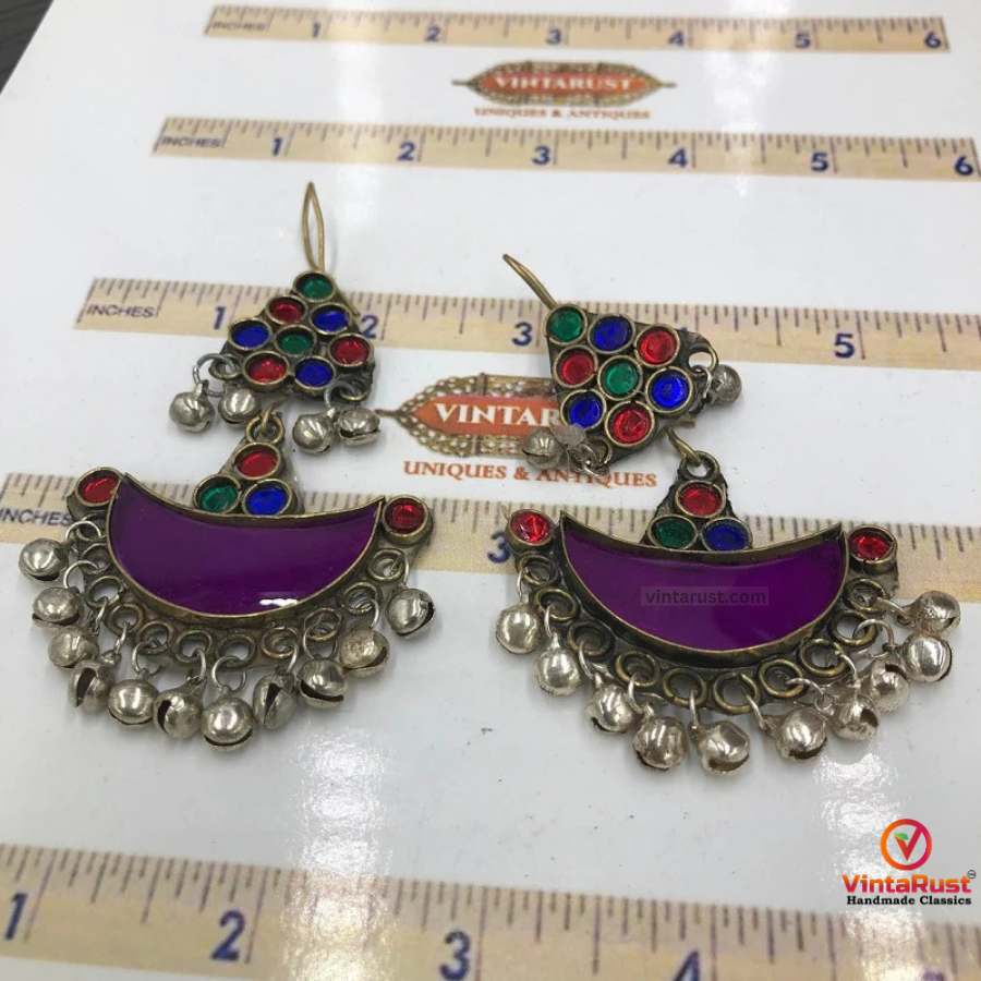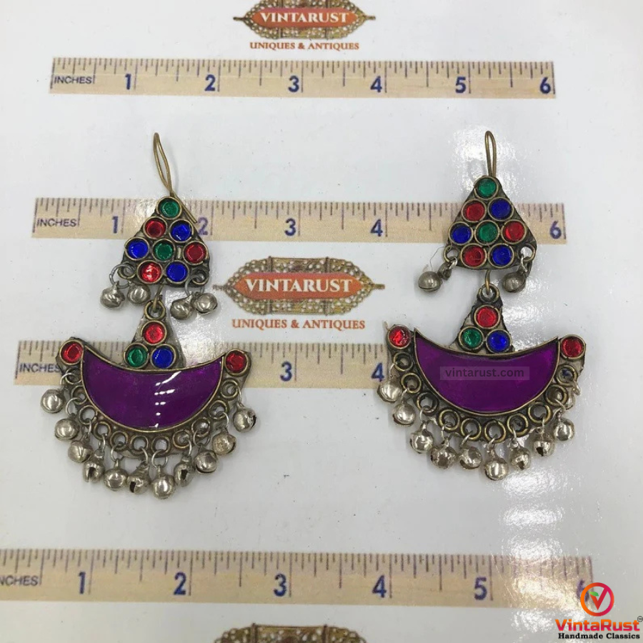 • This classic pair of earrings is one of the traditional designs we have in our collection. The multihued glass stones are appealing to the eye with a moon-shaped glass stone with drooping rhythmic bells at the bottom. The charming piece of tribal jewelry from the tribes of South Asia is fully representing the tribal culture with a historical feel.