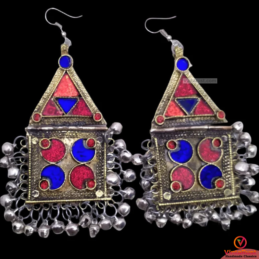 • This unique square shape vintage earrings are delicately handcrafted with fine quality metal and glass stone inlays, red and blue. The vibrant stones embedded within the carved patterns are completing the rustic copper-golden hues. The silver rustic bells attached at the each side are making it more alluring and captivating. These earrings belongs to our exclusive tribal vintage collection and this pair made its place with its classic and unique style. The ethnic earrings are light in weight and easy to be carried with any look.The earrings have a comfortable and secure fit, with a hook-style closure that is easy to use. They are lightweight and easy to wear, making them perfect for everyday wear or special occasions. These earrings are a perfect choice for anyone looking to add a touch of tribal style to their jewelry collection.