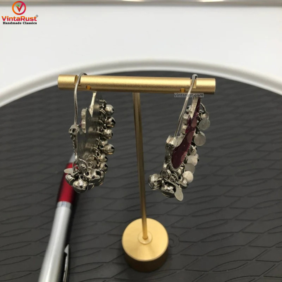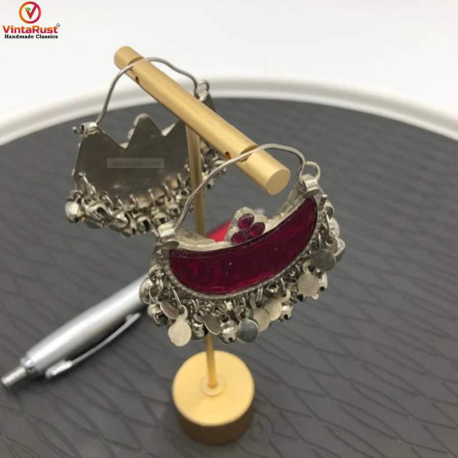 These oxidized silver crescent-shaped stunning Kuchi tribal hoops which are most commonly known as Chandballi among the tribal people are eye-catchy ornament from our collection. This pair of tribal hoops is one of the attractive and glorious pieces in our collection. Rhythmic bells provide a pleasing tone to this ornament with every movement.