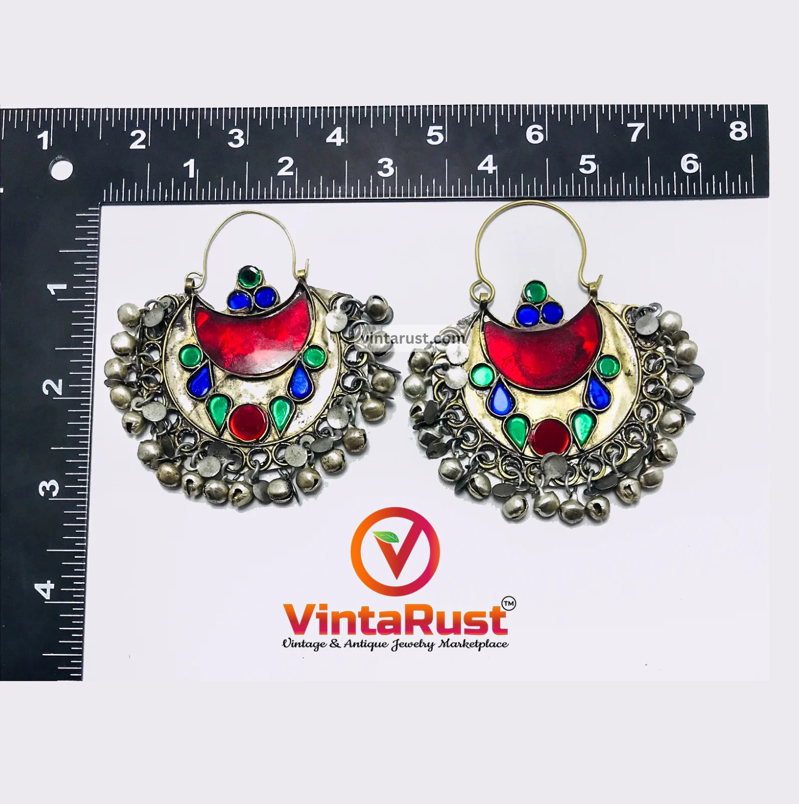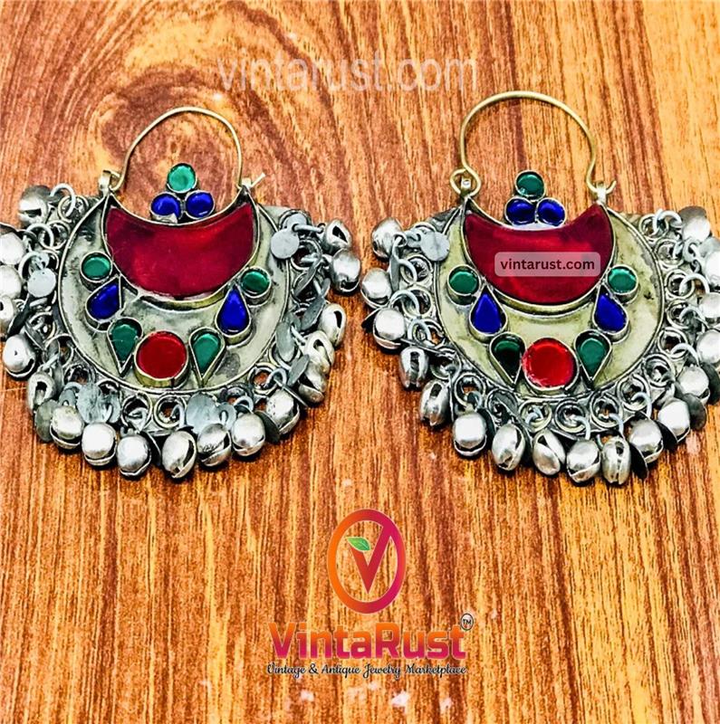 Afghani C-shaped tribal earrings are a tantalizing piece of tribal jewelry. The glass stones of different colors are inlaid in this piece of tribal art, charming red, green and blue glass stones are inlaid in this tribal ornament, which is known as chand balli by the natives.
