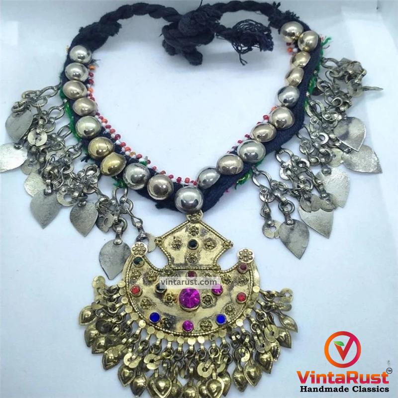 This traditionally rich tribal ornament is one of the incredible pieces of jewelry from our collection of Tribal Afghan jewelry. This ethnic tribal necklace with metallic gold and silver buttons and rhythmic tassels is a traditionally rich ornament. This amazing tribal choker necklace is comprised of an antique pendant. The pendant is adorned with dangling tassels and glass stones of multi-color.