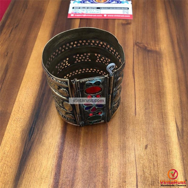Made with the finest quality of material this marvelous tribal piece is having an antique lock to secure this piece around the wrist in a magnificent way. The glass stones beautified on this tribal piece are of different shapes and depict the amazing skills of our talented craftsmen from Central Asia.