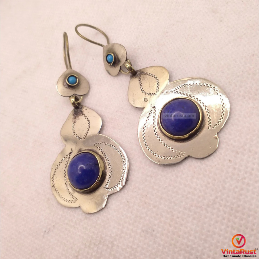 The dangling earrings are made by the local Himalayan artisans, preserving their heritage by making such astonishing pieces for centuries. This master craft is made with metal alloy and covered with rustic silver hues, while the center of earrings is ornated with a semi-precious stone inlay. The classic motifs are carved all over the pair is flourishing the vintage touch it has.