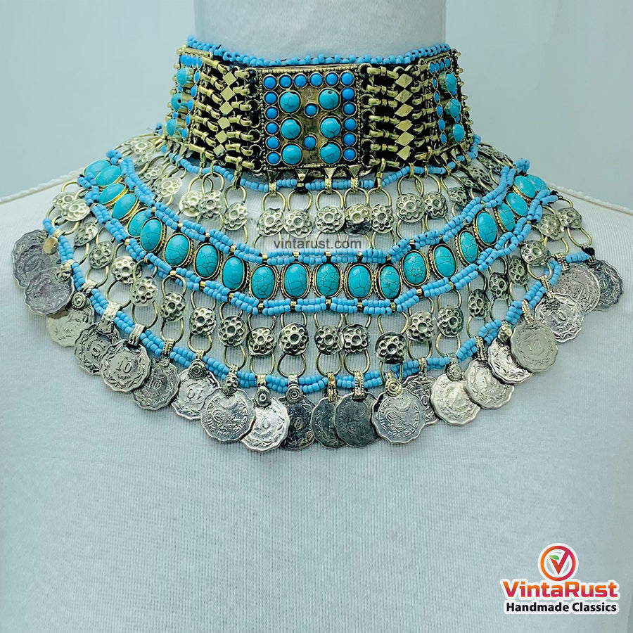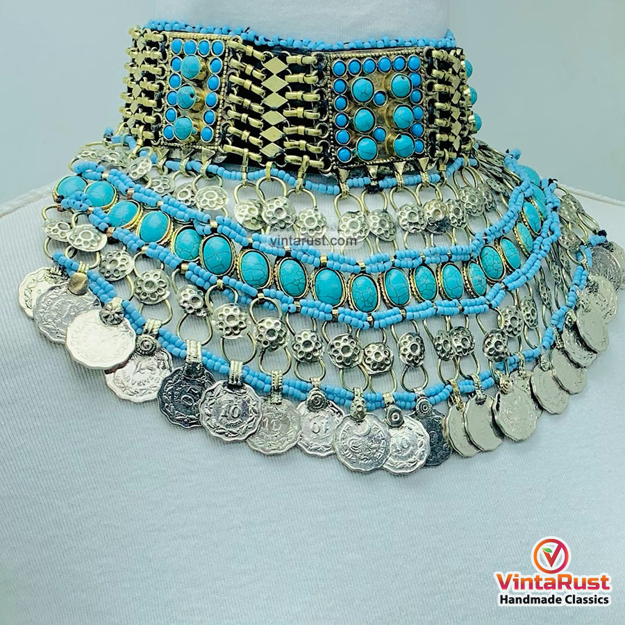 Its vintage-inspired design will successfully make its place in your heart. The classical neckpiece is embellished with semi-precious stones and beads. The blue hued stones are making it more alluring and giving a contrast to the blue beads assembled in the choker part. Tribal coin tassels are what make this jewelry item an alluring piece from our collection.