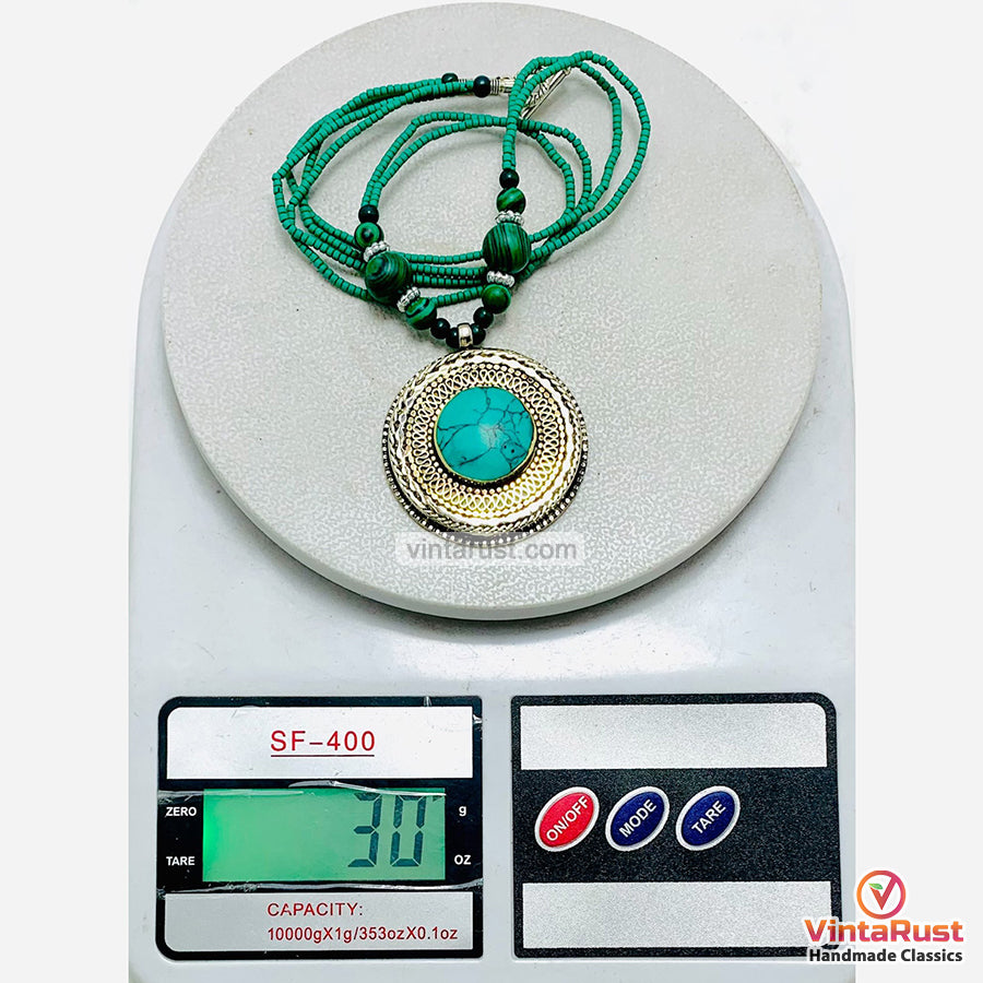 The centerpiece of this necklace is a captivating turquoise pendant, exuding charm that complements a variety of fashion styles. Each bead in this necklace is meticulously chosen and strung to create a harmonious blend of colors and textures. The result is a striking piece that adds a touch of cultural richness to your look.