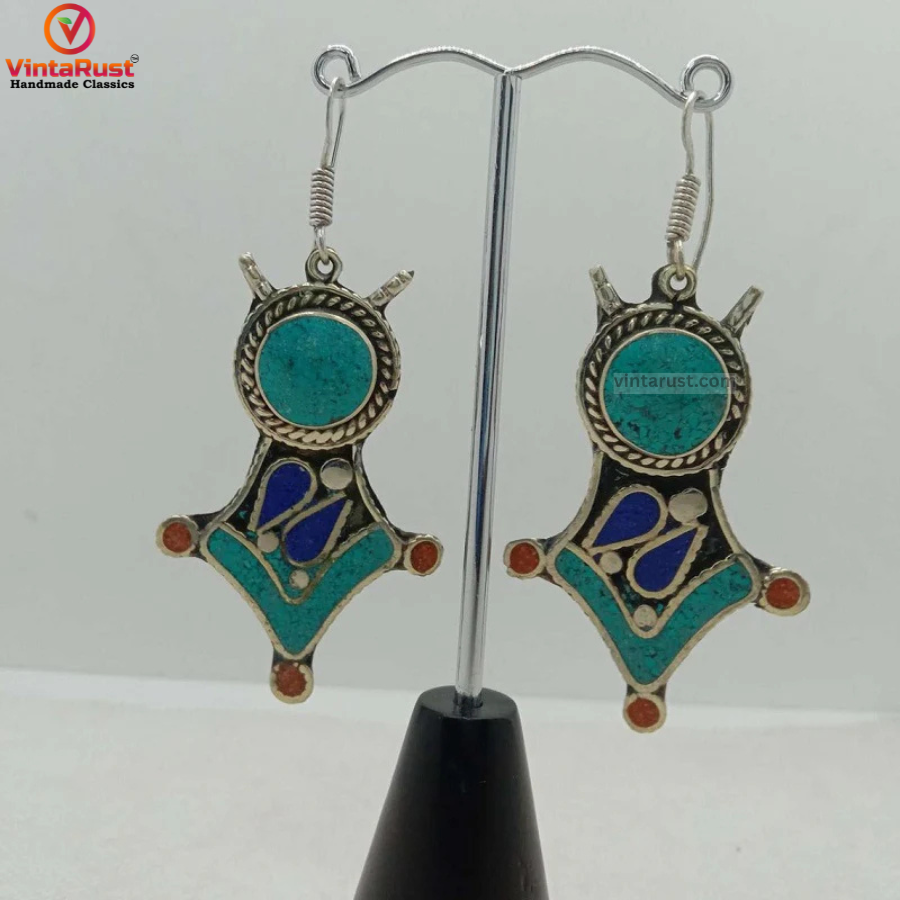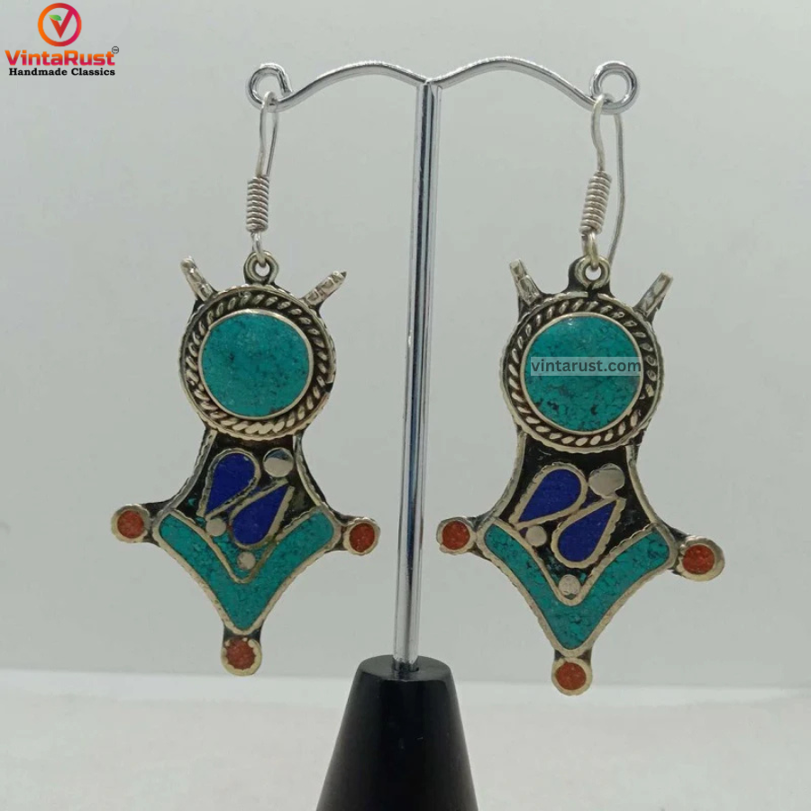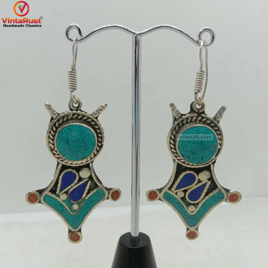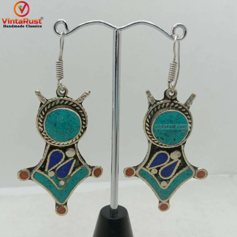 The Turquoise Dangle Earrings featured on the Vintarust website are Nepalese-style earrings made of high-quality turquoise gemstones.These unique tribal earrings are one of the best casual wearing ornaments, which give you a full traditional and satisfying look. Made with sterling silver, these tribal earrings will enhance your look with any outfit whether eastern or western.
