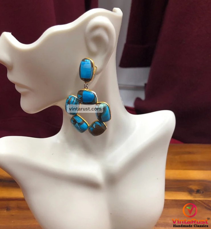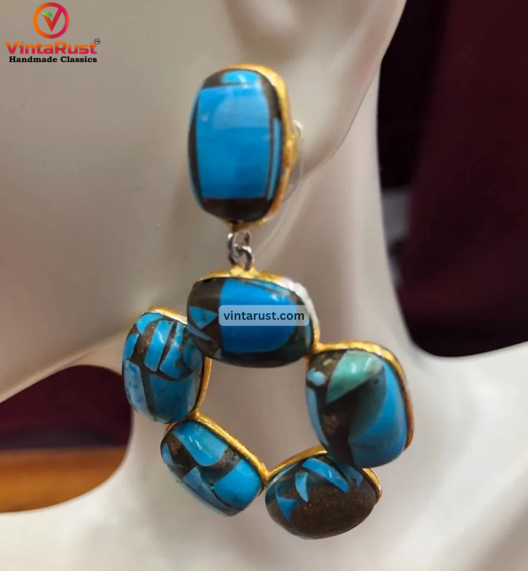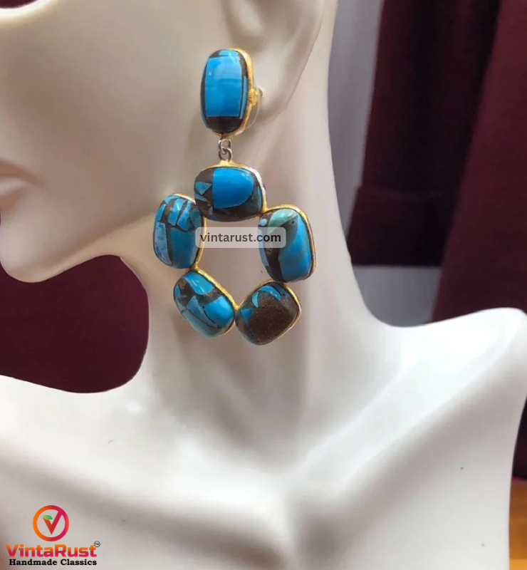 These elegant Indian-style earrings are inlaid with semi-precious blue turquoise stones. These earrings are decorated with turquoise stones in a unique design. These delicate semi-precious stones earrings move freely and hang loosely when worn. These turquoise stone earrings are simple yet elegant and are the perfect addition to your jewelry collection.