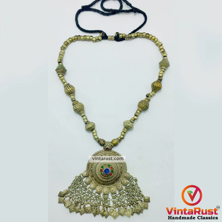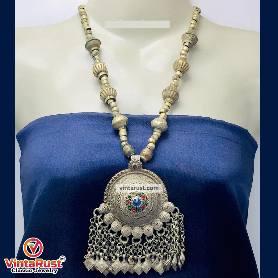 This historically rich tribal necklace is one of our collection's most unusual and gorgeous tribal jewelry. This wonderful tribal decoration has a retro and antique appearance. In the middle of the necklace is a gorgeous large silver pendant with appealing multi-colored glass stones and an ancient style. Silver hanging bells are placed throughout the necklace to add a classic touch.