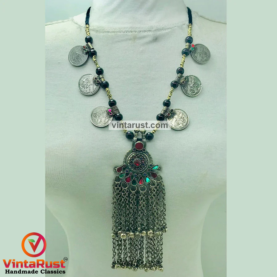 The main cord of this vintage pendant necklace is adorned with beautiful beads and astonishing antique hanging metal charms. This Beautiful vintage ethnic necklace has an antique pendant, designed with colorful glass stones of red, orange, and green colors and jingling bells dangling with the pendant. This marvelous long chain ethnic pendant necklace has a unique, distinctive pendant that sets you apart. This necklace features a pendant that is an eye-pleasing piece.
