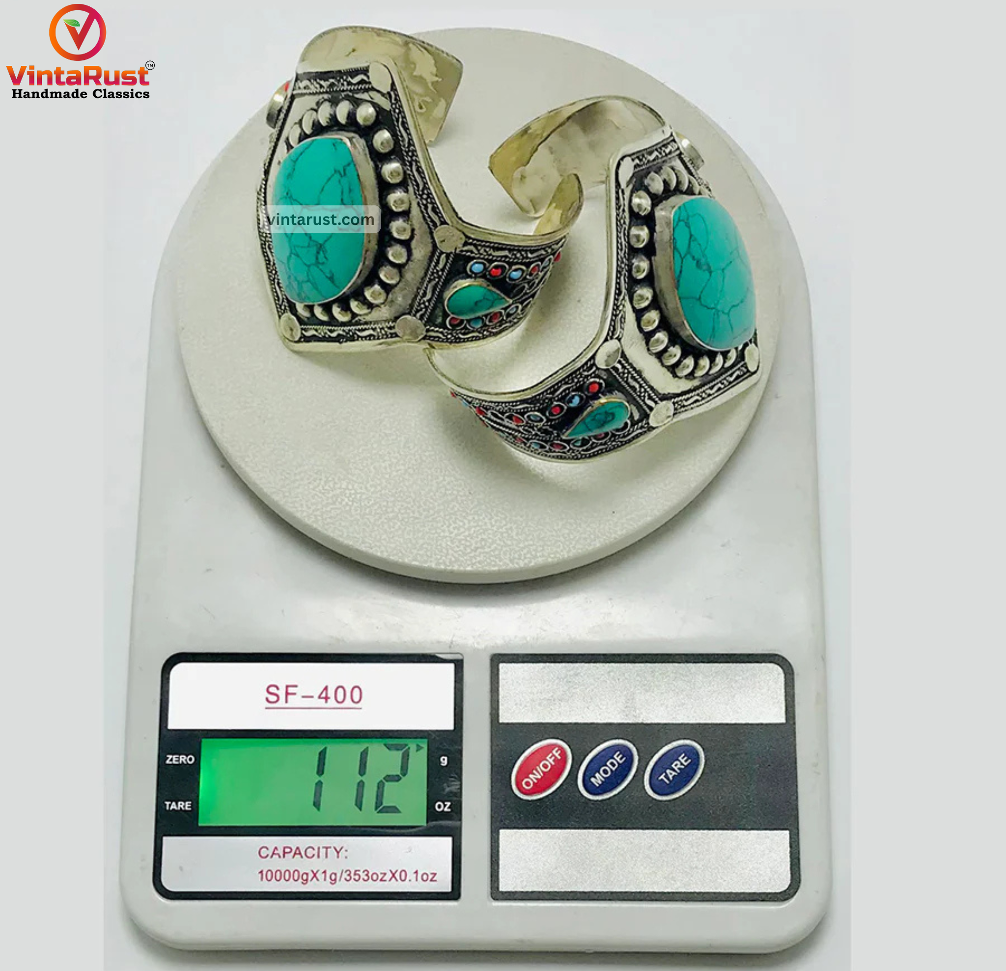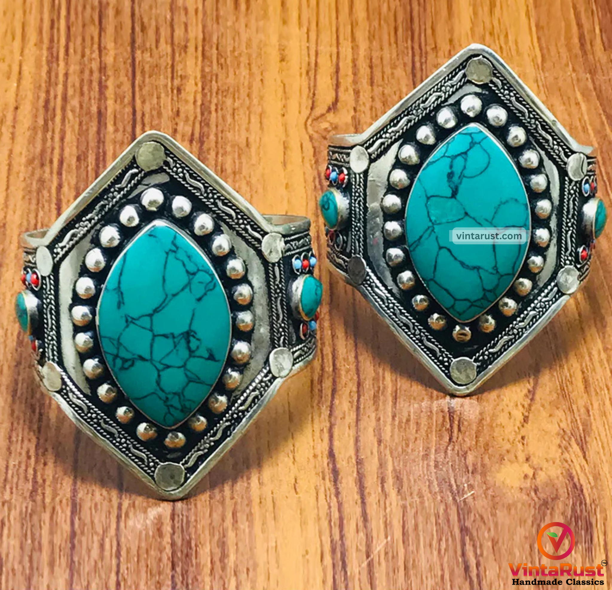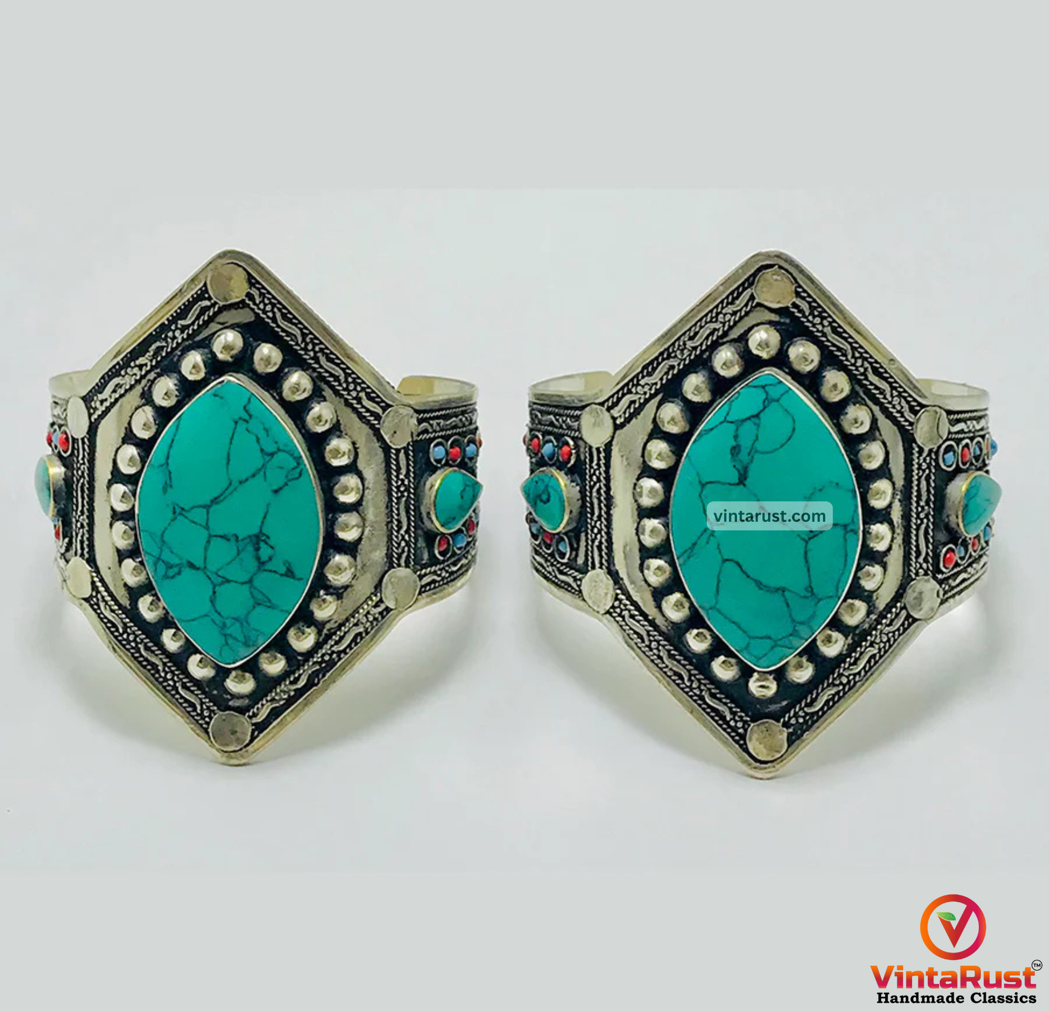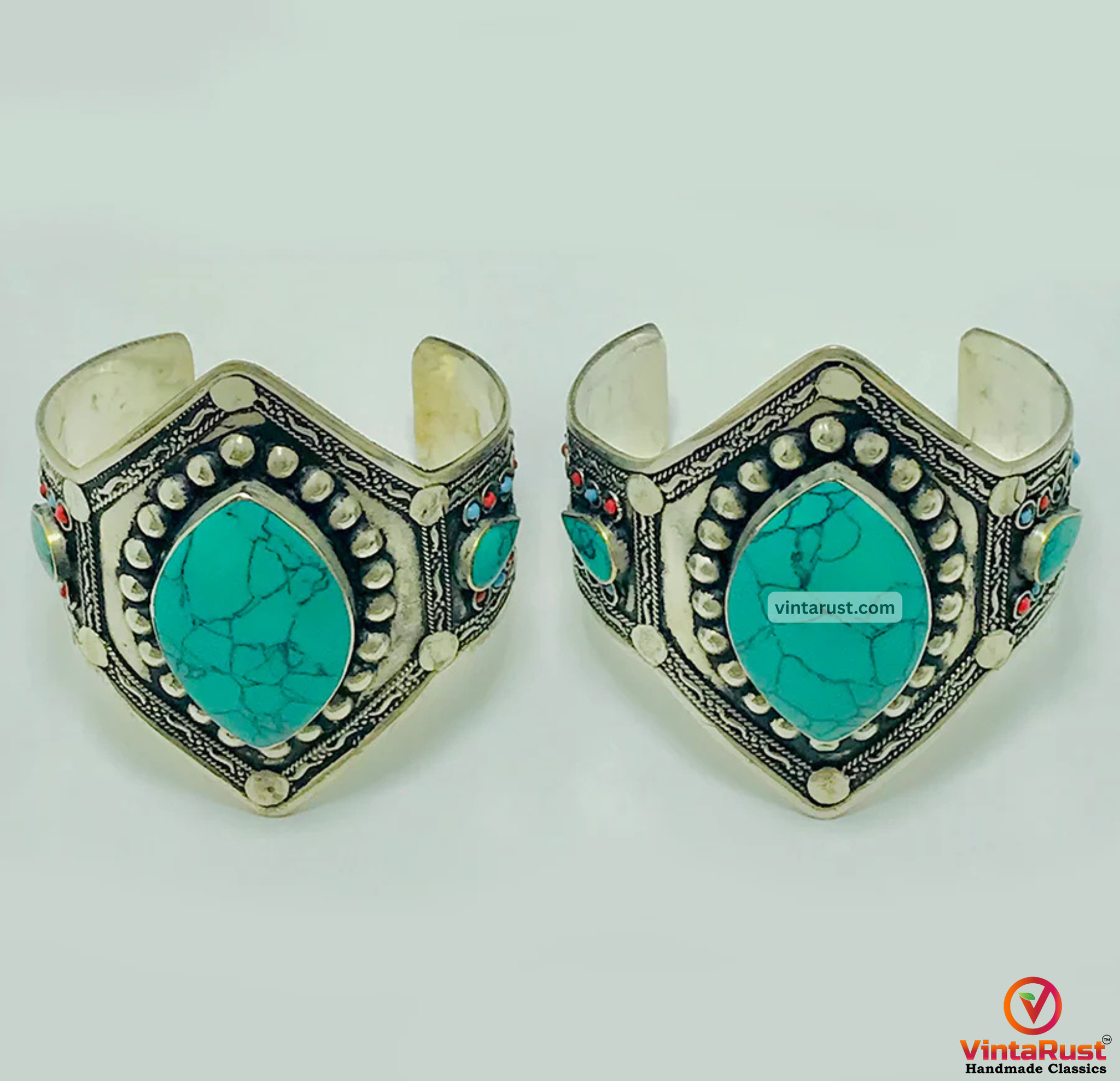 This vintage-inspired Kuchi tribal handcuff bracelet features bold turquoise stones and striking black stone inlays, giving it a bold and rustic look. With its adjustable back-open design, this cuff bracelet easily adapts to your wrist size for a comfortable fit. Crafted from high-quality metal alloy and adorned with rustic silver hues, this piece brings timeless tribal charm to any outfit.