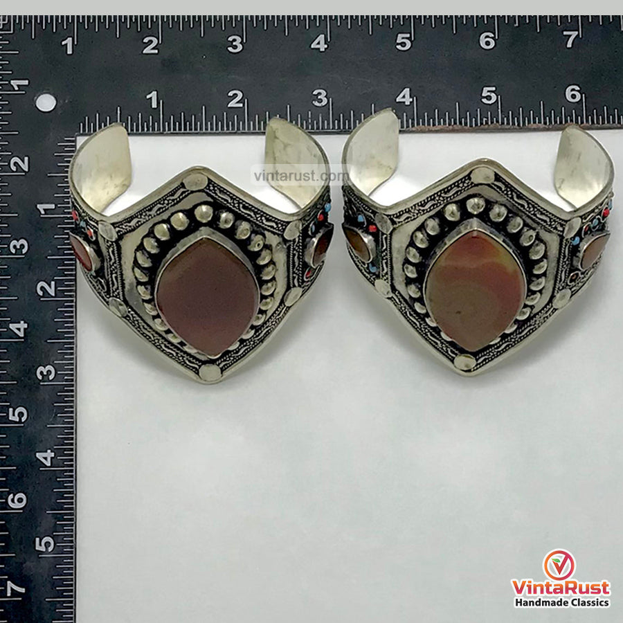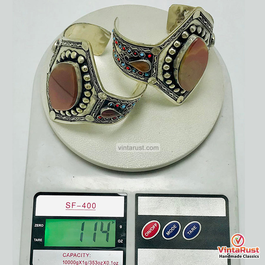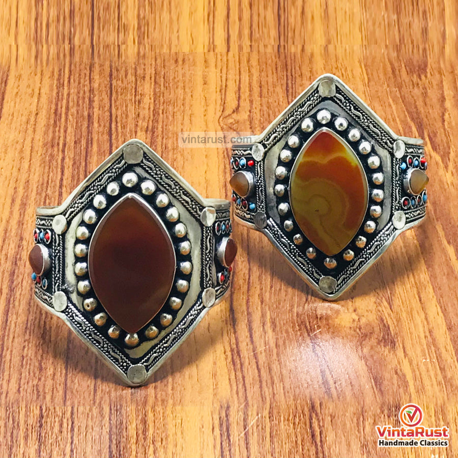 Experience the timeless beauty and craftsmanship of Afghan tribal jewelry with these mesmerizing cuffs. Each cuff features enameled brown stones, showcasing one oval-shaped semiprecious stone at the center with hammered design.