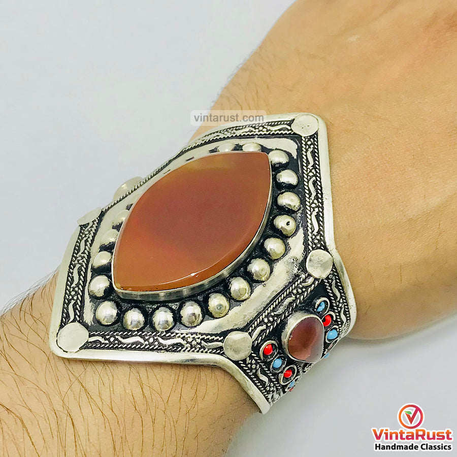 Crafted with the attention to detail, this Afghani brown stone tribal cuff boasts exquisite filigree engraving and hammered designs, lending them a rustic allure. Despite its bold appearance, this brown enamel stones cuff bracelet is surprisingly lightweight and comfortable to wear. Tiny red coral and turquoise semi-precious stones at the sides of this bracelet are making this piece more attractive.